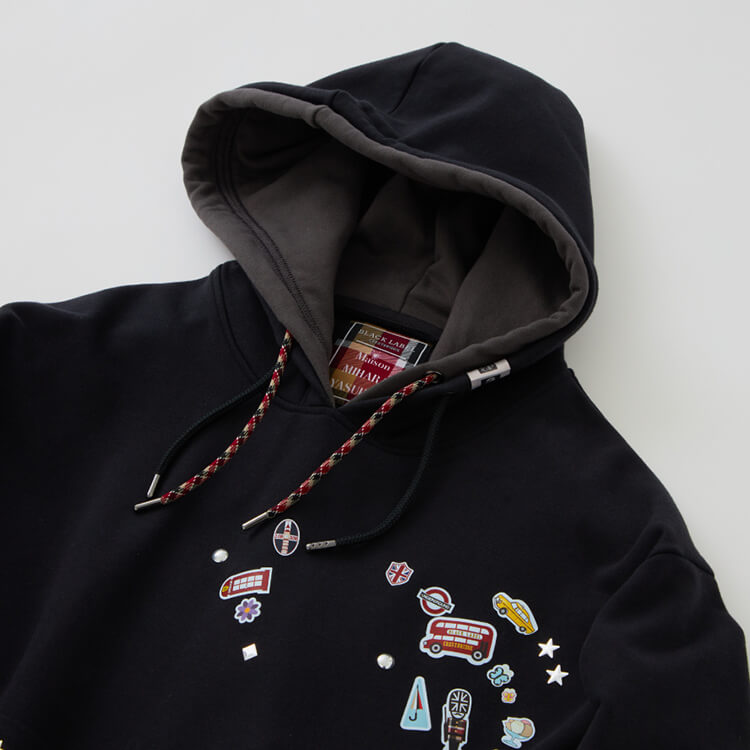 フードのフェイクレイヤードディティールや全体に散りばめられたシールプリントはメゾンミハラヤスヒロならではのデザイン。そこにコラボレーションネームやチェックのドローコード、ブリティッシュグラフィックのシールモチーフなど、ブラックレーベルらしいエッセンスをプラス。