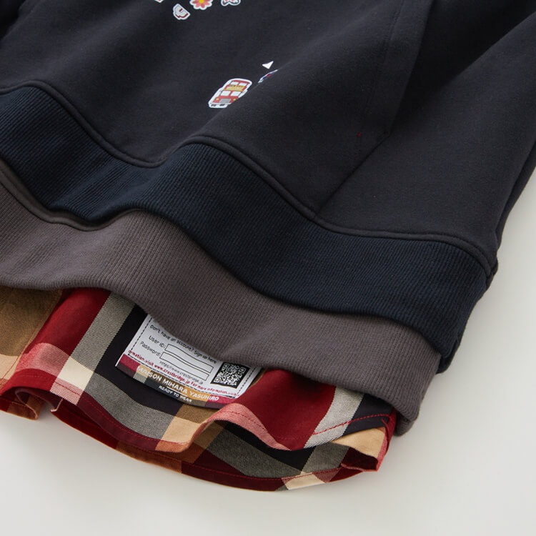 フードと同じく裾も、シャツとフィーディをレイヤードしているかのような仕様に。クレストブリッジチェック柄のシャツテールがブラックレーベルらしさを演出し、デザインのアクセントに。裾のコラボレーションネームもQRコードを配するなど、こだわりのディティールを詰め込んでいる。