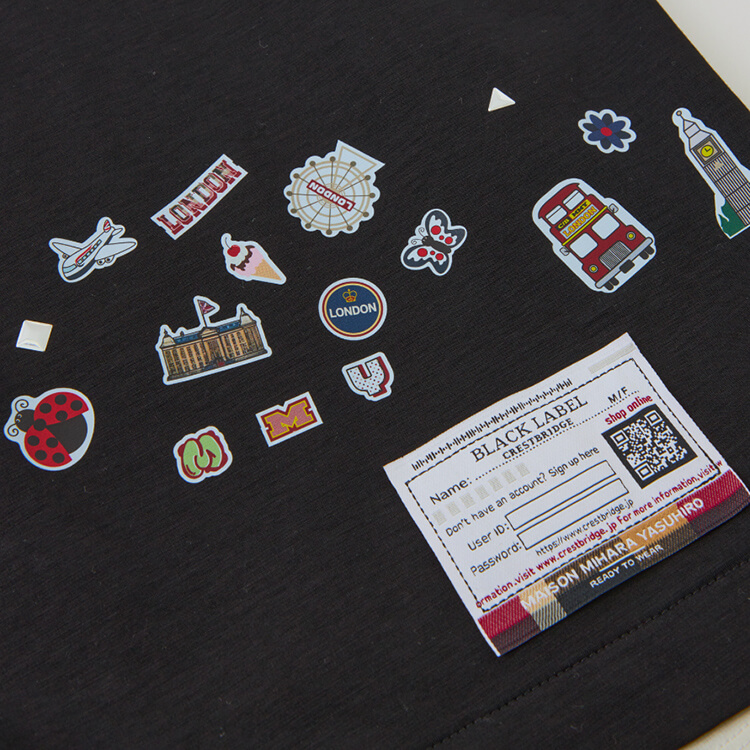 全面に散りばめられたブリティッシュモチーフのシールプリントが何よりのポイント。子供がいたずらで貼り付けたような遊び心満載のデザインが魅力的。シンプルになりがちなTシャツを1枚でコーディネートの主役になるアイテムへと昇華。Tシャツも裾はシャツテールをドッキングしたレイヤードデザインで、こだわりと遊び心を詰め込んた一着となっている。
