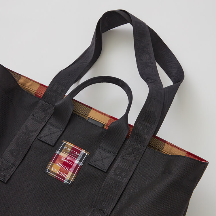 一見シンプルな黒トートバッグだが、内側は全面クレストブリッジチェックに。持ち手はオリジナルのロゴテープで、手持ち・肩掛けそれぞれ使える2WAY仕様となっており使い勝手の良さも兼ね備えている。クレストブリッジチェックが目を引くコラボレーションネームもアクセント。