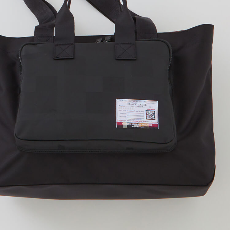 本体には軽量で耐久性に優れた素材を使用。iPadなどが入る外側ポケットはアイコンのクレストブリッジチェック柄を織りで表現したシャドーチェックになっている。デザインのアクセントになったコラボレーションネームもポイント。シンプル見えするがこだわりのつまった万能トート。
