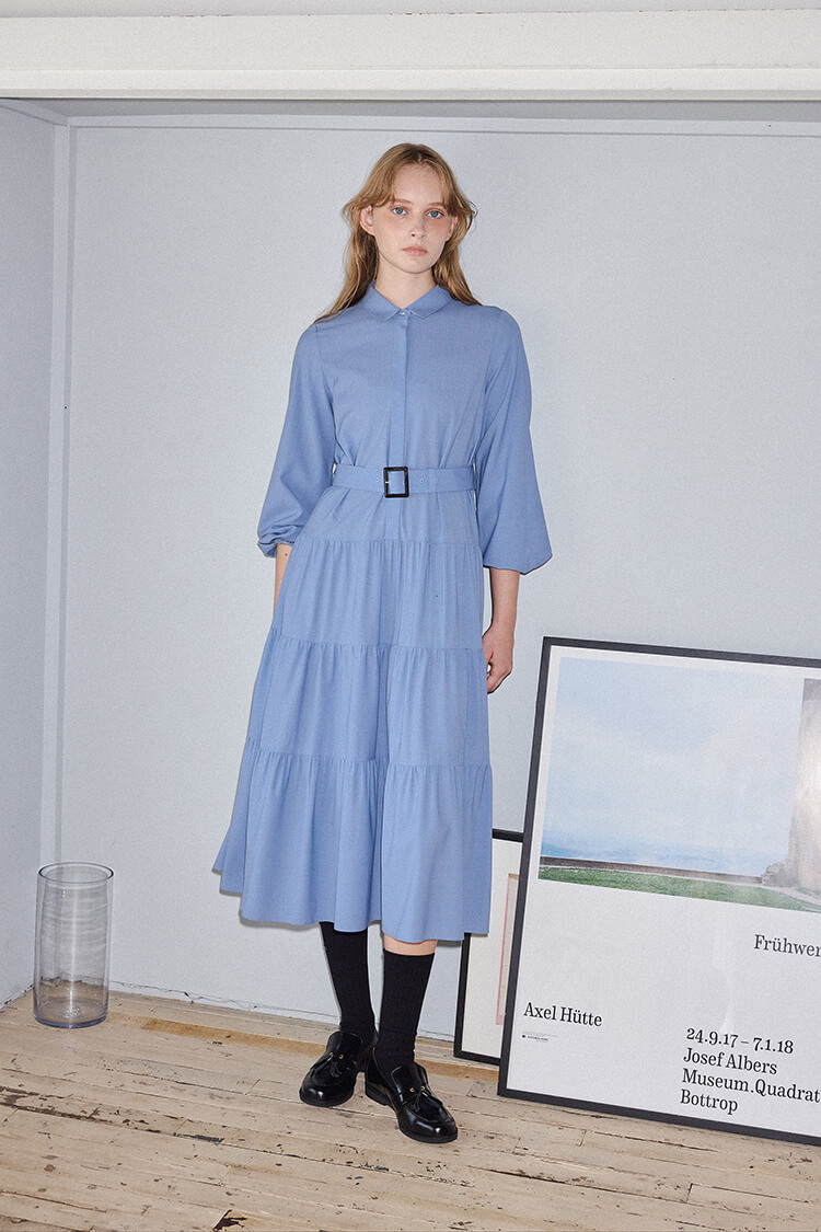 厳選された原料を使用した高品質な生地のドレス。糸にねじりを加え、ウールでありながらシャリ味や清涼感を出した上質な手触りも魅力。ふんわりと広がるスリーブやティアードデザインが華やかながら、ブルーレーベルらしい上品さも薫る1枚。