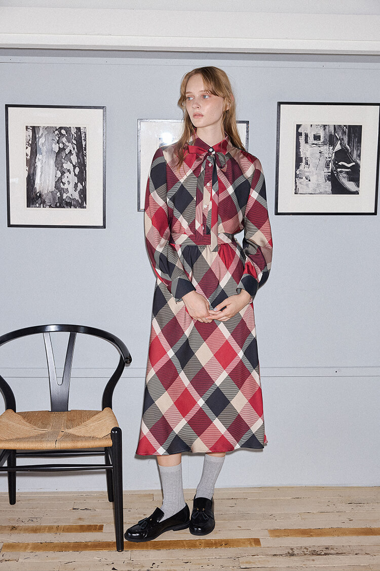 繊細な細番手の糸を使用した、しなやかなタッチが特徴のサテン生地のブラウスとスカート。高発色が叶うプリント手法で表現した、鮮やかなチェックが美しい。セットアップでドレスのように着こなして。