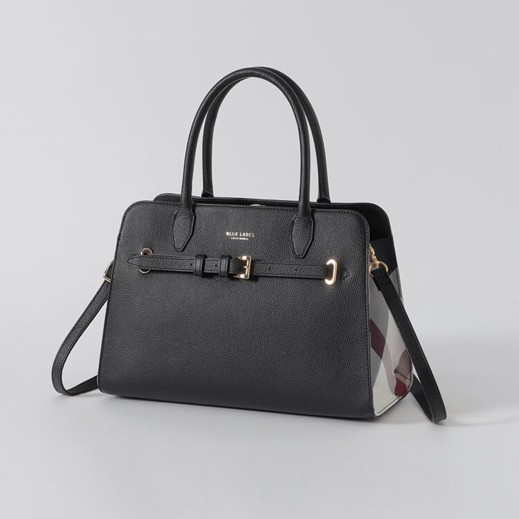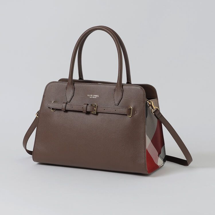 美しい佇まいのレザーボストンバッグ。フロントのベルトディテールとサイドに配したクレストブリッジチェックでブルーレーベルらしさをON。