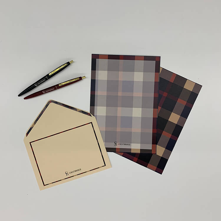 シービー・クレストブリッジを象徴するネイビーチェック柄をあしらった便箋と封筒に、ブランドロゴ入りのボールペンを添えて。落ち着きと気品を感じる佇まいが、大切な人に想いを綴る時間を、より特別なものにしてくれます。