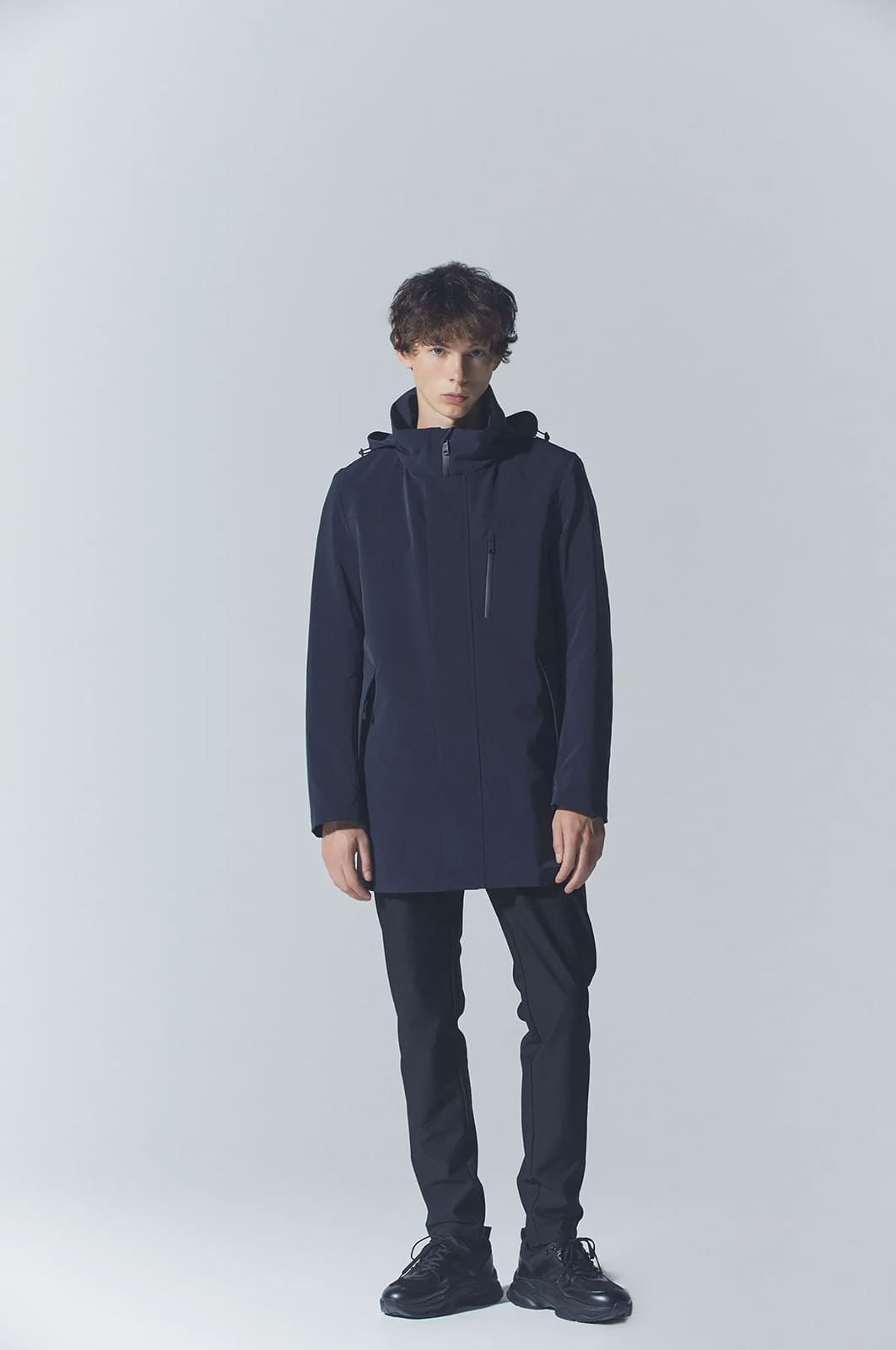 オン・オフ兼用、万能コートのベストチョイス。カジュアルスタイルはもちろん、ジャケットスタイルの上から羽織れる膝上丈のスタンドカラーコートである。特徴的なフロントデザインを持つミリタリーの防寒パーカーをベースに表地を現代的なハイパワー2WAYストレッチナイロンタフタで仕立て、「モダンミリタリー」の模範解答といえる一着が完成した。随所に施した止水ファスナーも、デザインの一部となっている。取り外し可能な袖付きの中綿入りライナーが付いた2WAY仕様で秋口から真冬までロングスパンでの着用を約束。このコート以上に着用頻度の高さを約束してくれるものはあるだろうか?と思うほど、万能な一着である。