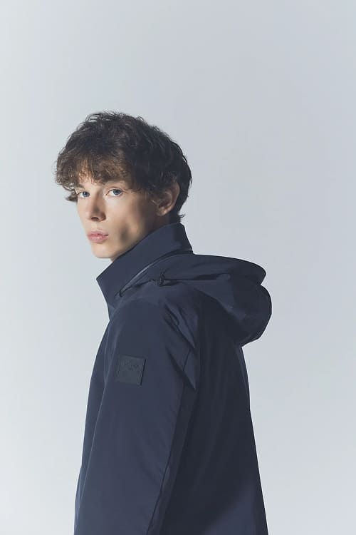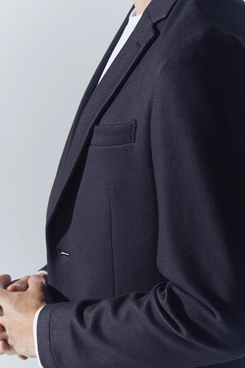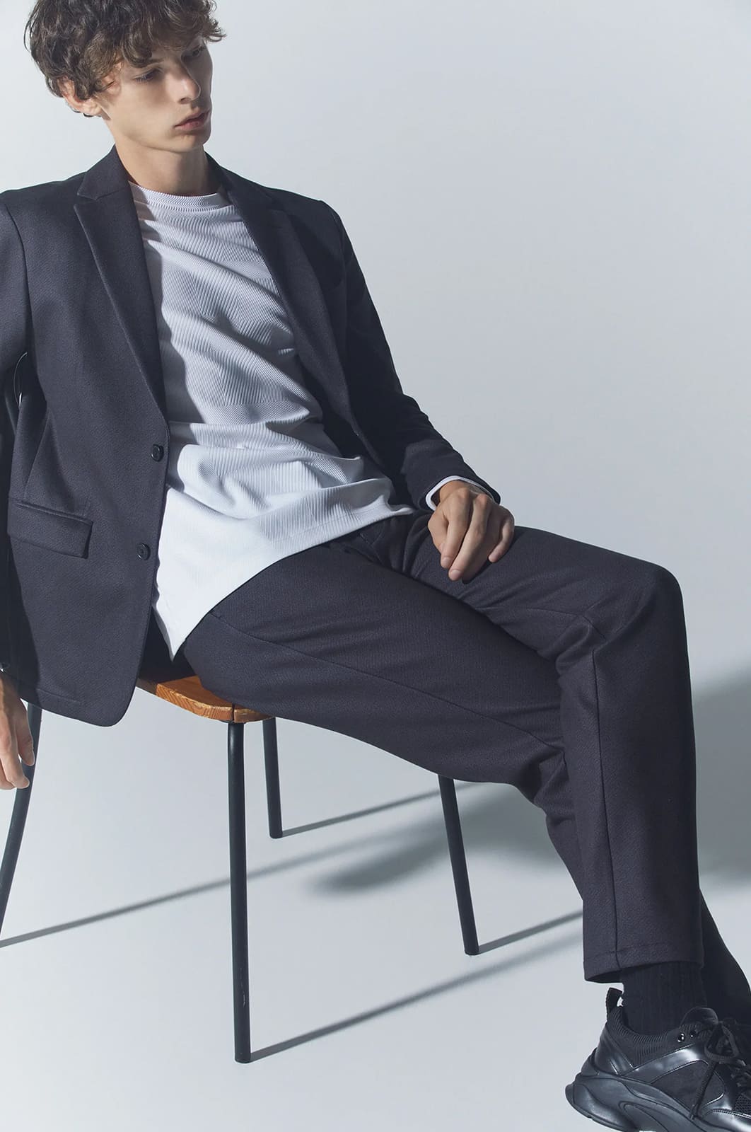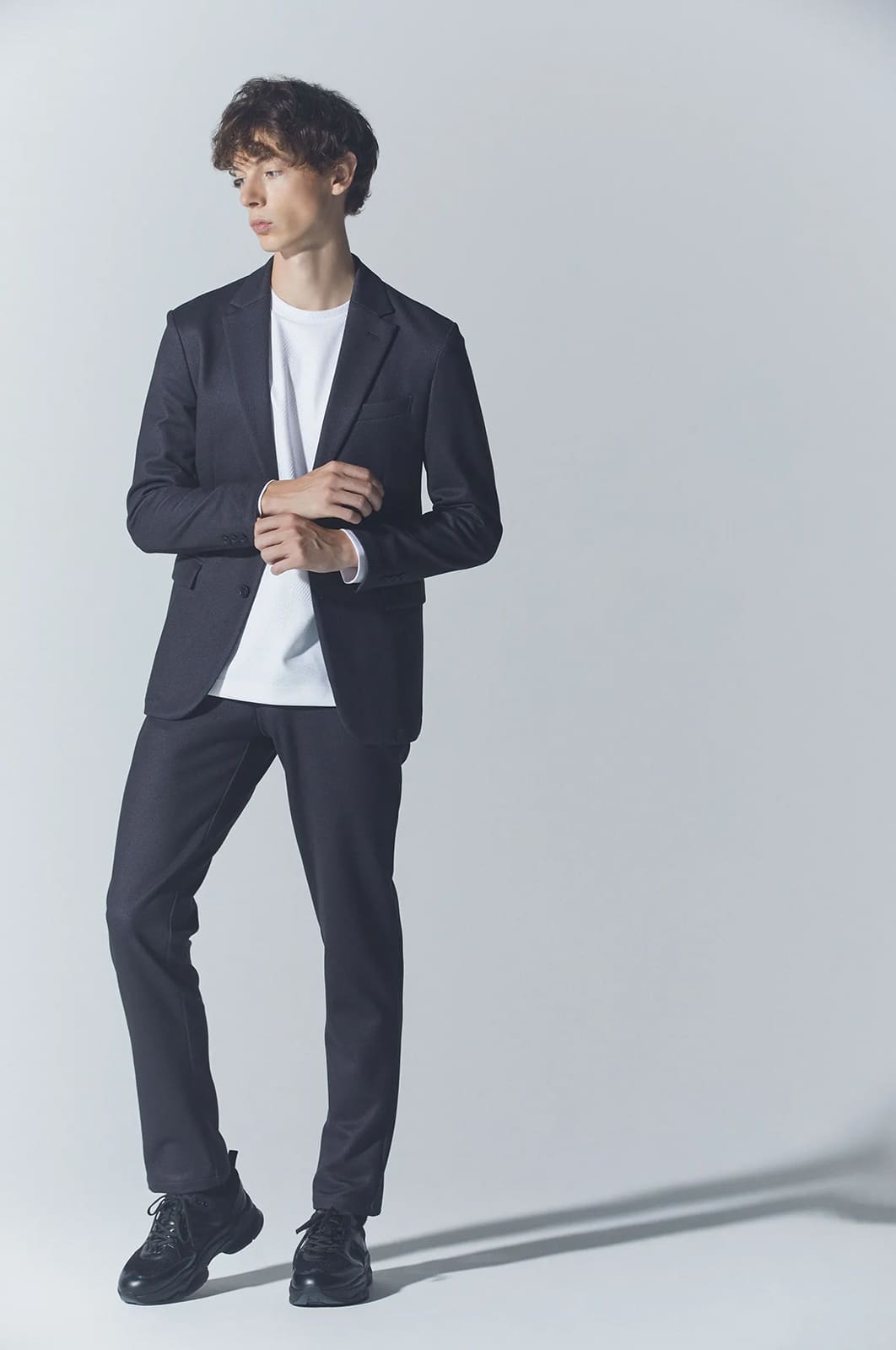 秋冬ビジネスウェアに革命を。そんな思いで作ったのが、このライトウェイトダウンファブリックのセットアップである。現代的なアンコンジャケットとノープリーツトラウザーズは、薄い生地の中間層にダウンを吹き付け貼り合わせた3層構造素材「ダウンファブリック」を使用。「薄いのに暖かい」という生地特性を生かし、無駄な裏地を省き、軽さと動きやすさに加えて洗練されたシルエットも実現。裏地には極薄のレーヨン×ポリウレタンの天竺を使用し、肌に触れる部分はなめらかで心地良い。つまり、今どきなビジネススタイルである半袖のカットソーを合わせるコーディネイトが今の時季でも楽しめ、合わせるインナー次第では真冬も大活躍間違いなし。しかもマシンウォッシャブル対応のイージーケアもポイント。