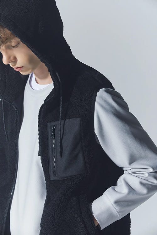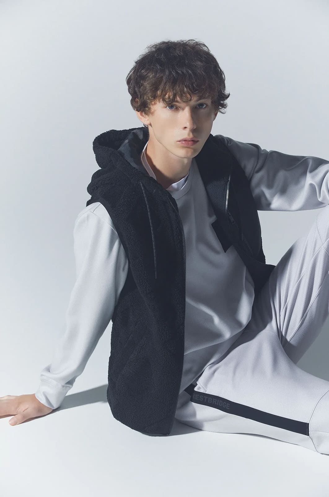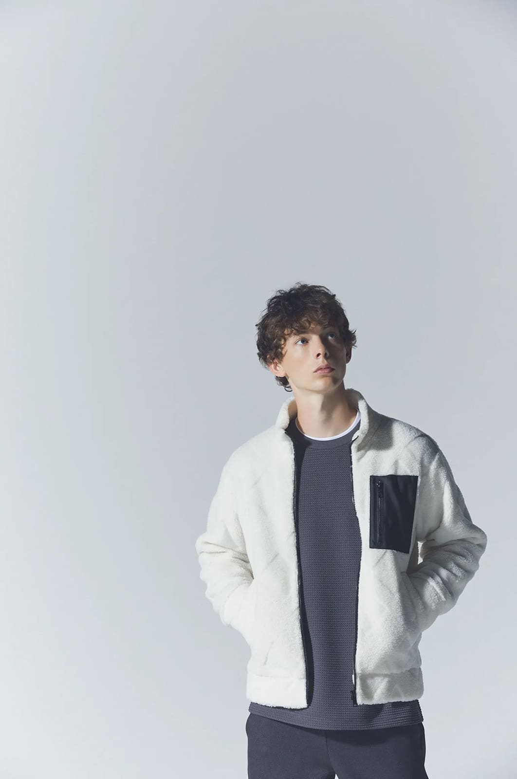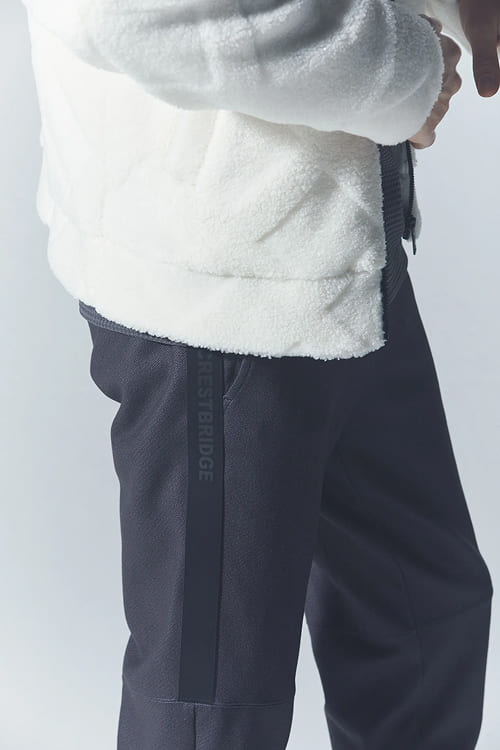 ちょっとした外出に、少し肌寒い室内用に、旅の移動に、一着持っていると使えるのがこのボアを使ったジップアップブルソンとベストである。ポイントは裏地に使用した高機能素材「Octa® CPCP®」。特殊断面ポリエステル繊維で作られたこの素材は、表面は通気性の高いメッシュ地、裏面に起毛繊維が付いた中綿一体型構造になっていて、軽さと暖かさを両立しているのだ。モコモコとした素材感で肌触りが気持ちいいボア素材に、クレストブリッジならではのチェック柄を組織の凹凸で表現したデザイン性もポイントだ。合わせたスウェットセットアップも、高機能素材である「ダウンファブリック」を使用したもの。これは3Dプリンターの蓄積技術を応用し、薄い生地の中間層にダウンを吹き付け貼り合わせた3層構造のハイブリッドな素材なのだ。このハイテク素材によるボアとスウェットとのコーディネイトで、想像を軽く超える暖かさと軽さを両立させたシティスタイルを楽しんで。