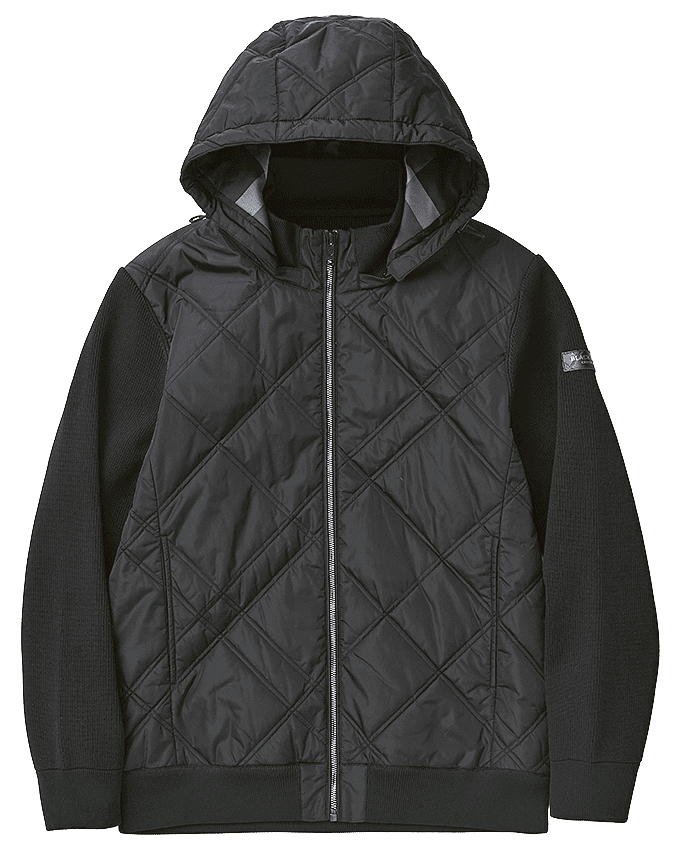 スリーブや後身頃はニットで編み立て、フロントやフード部分は中綿入りのキルト素材で切り替えたハイブリッドアイテム。モノトーンでありながら、素材の妙でオリジナリティの高いデザインを生み出している。