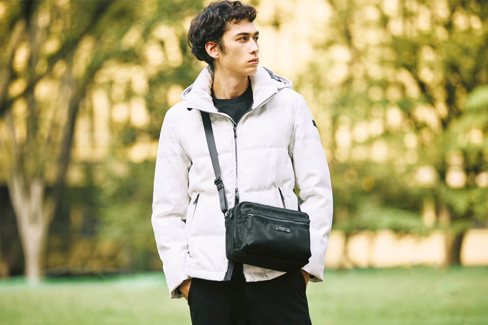 「BLACK OF BLACKs」シリーズとして登場した、ナイロンジャカード素材のデイパックとミニショルダー。どちらもCBチェック柄を織りで表現した都会派デザインが特徴で、着こなしのポイントになる。
