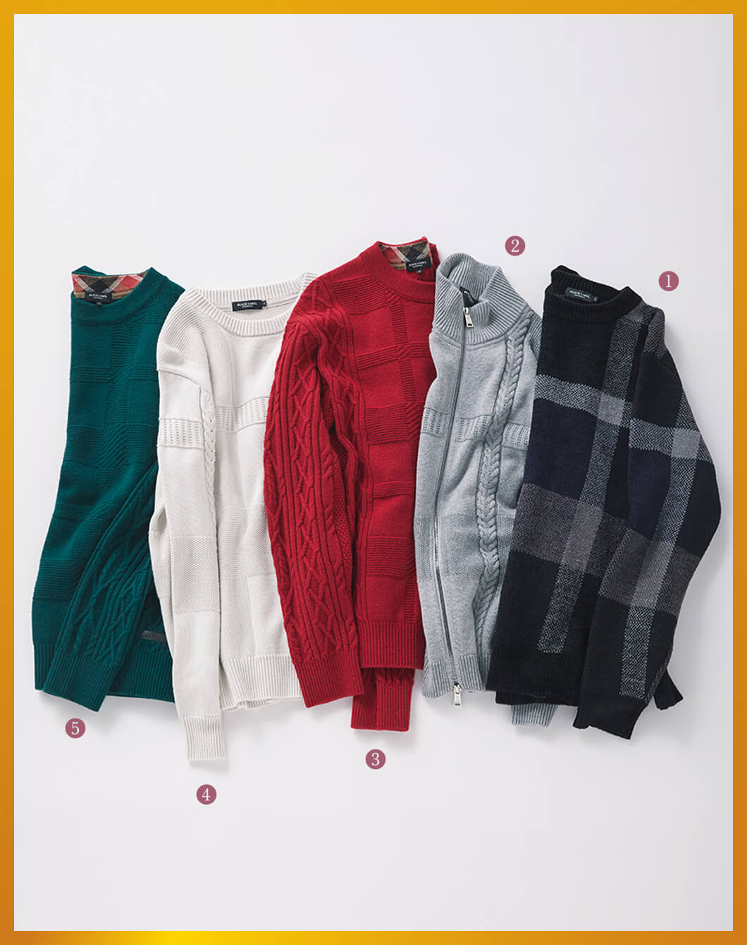 3&5気持ちいい肌触りのカシミヤ混ウール素材を3本の撚り糸にして立体感のあるアラン柄を表現した「カシミヤミックスアランニット」。衿の内側には、バイヤス使いのCBチェックをジャカード編みで配し、ブラックレーベルならではのさり気ないアクセントに。Knit ¥41,800