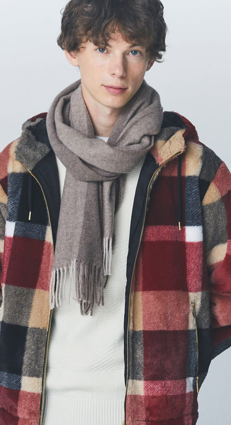 3コーディネートに合わせてCBチェックと無地の2面をリバーシブルで使えるマフラー。カシミヤアウールの気持ち良さを楽しんで。180×32.5cm