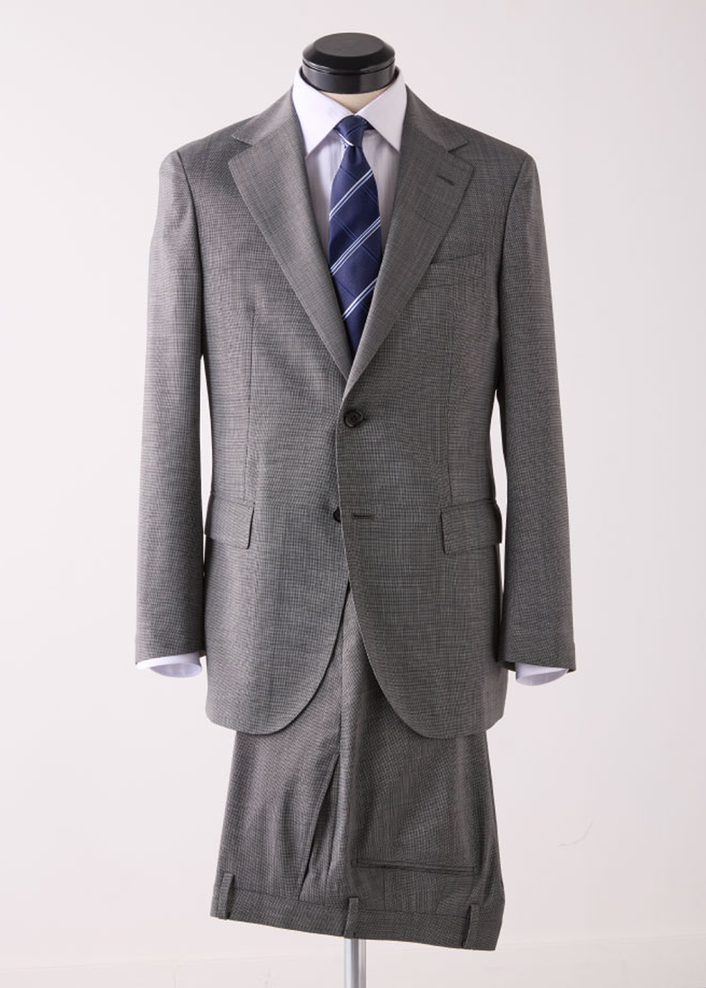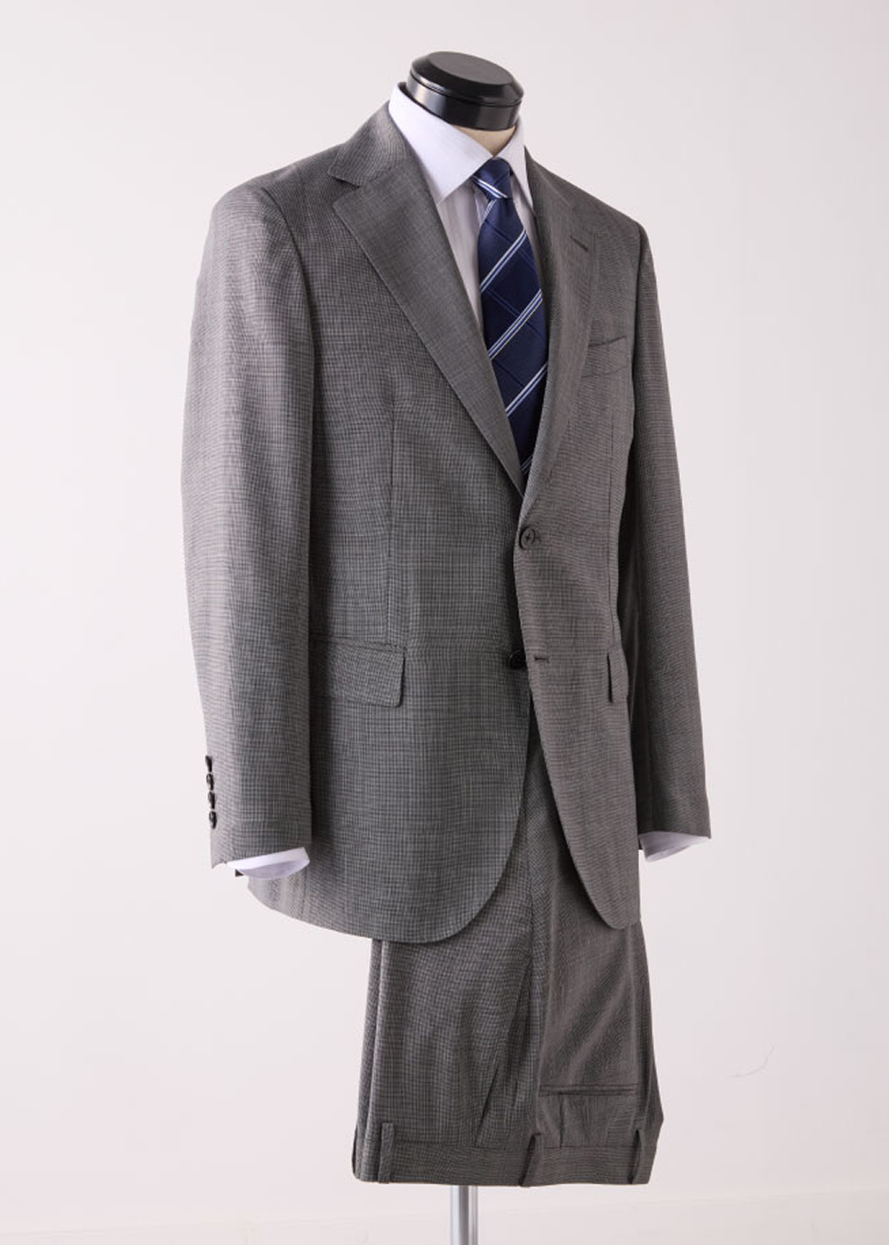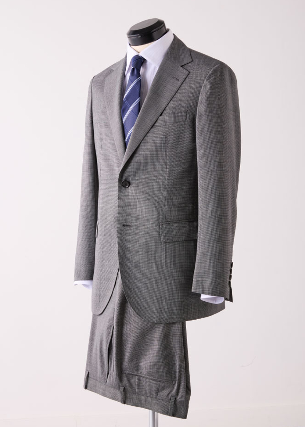 明るめのグレートーンで仕立てられた一着。上質な極細番手のウール混ツイルが、品のある表情を生み出している。春の立ち上がりから盛夏まで着用できる軽やかな生地感に加え、ウォッシャブル仕様と防シワ性を備えているのも魅力だ。遠目には無地に映るが、実は繊細なピンヘッド柄。控えめな中に奥行きを感じさせる、さりげないアクセントとなっている。シャドーストライプの白シャツに、ブルー系のブロックチェックタイを合わせれば、軽やかさと端正さを併せ持つ、春らしくフレッシュなスタイリングが完成する。