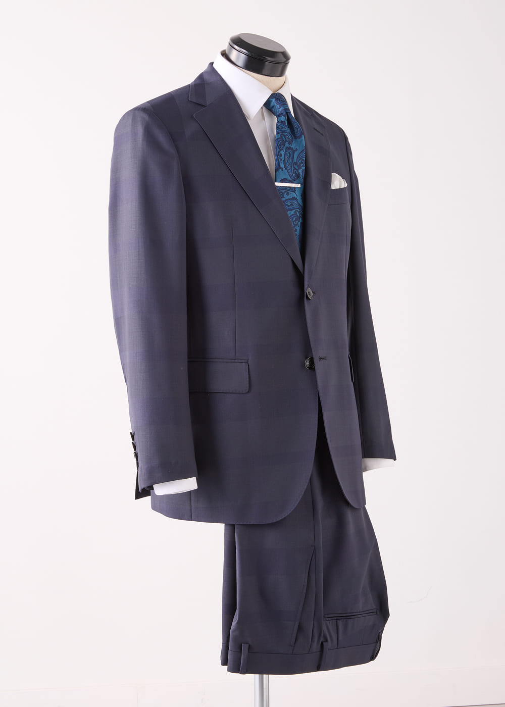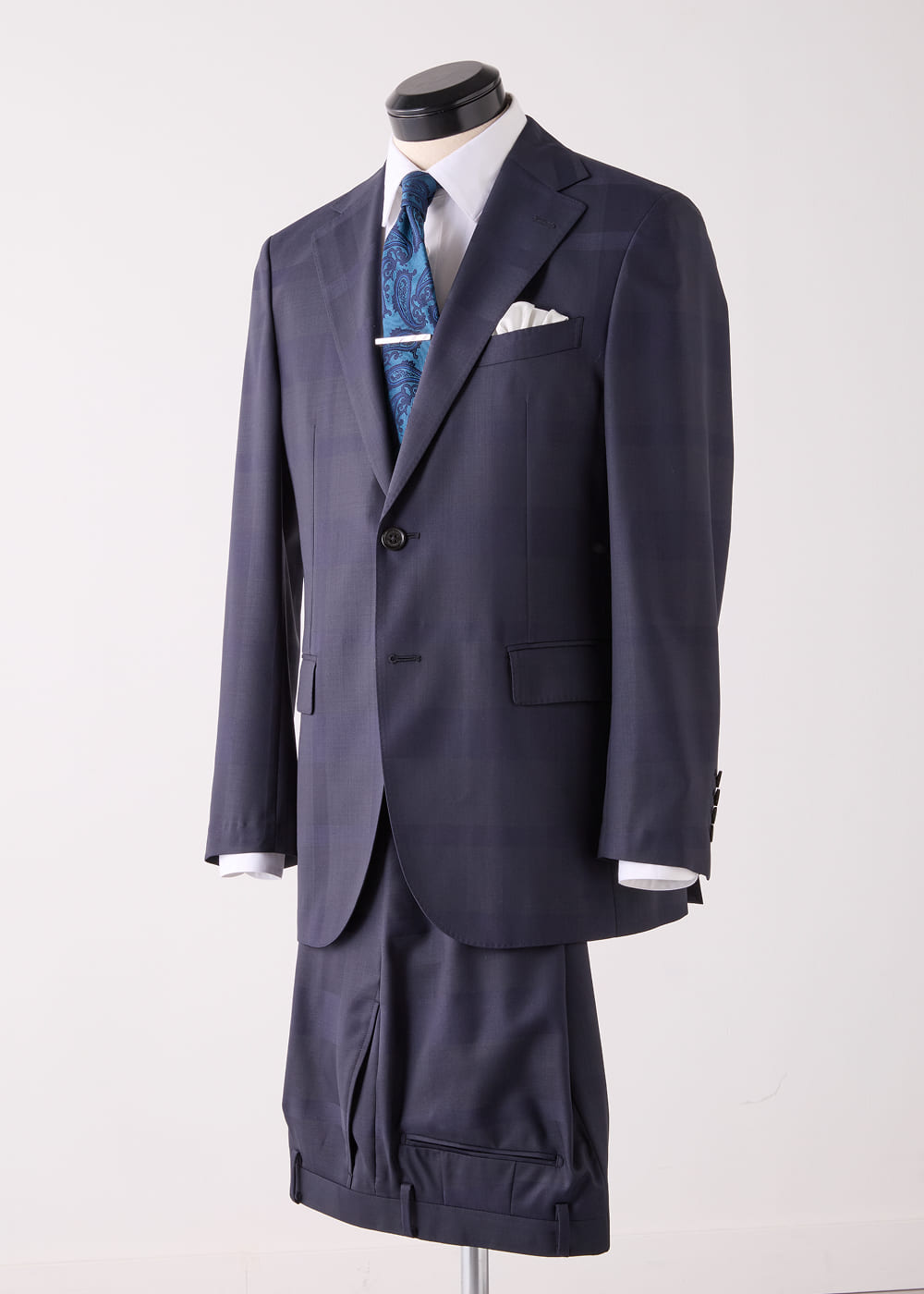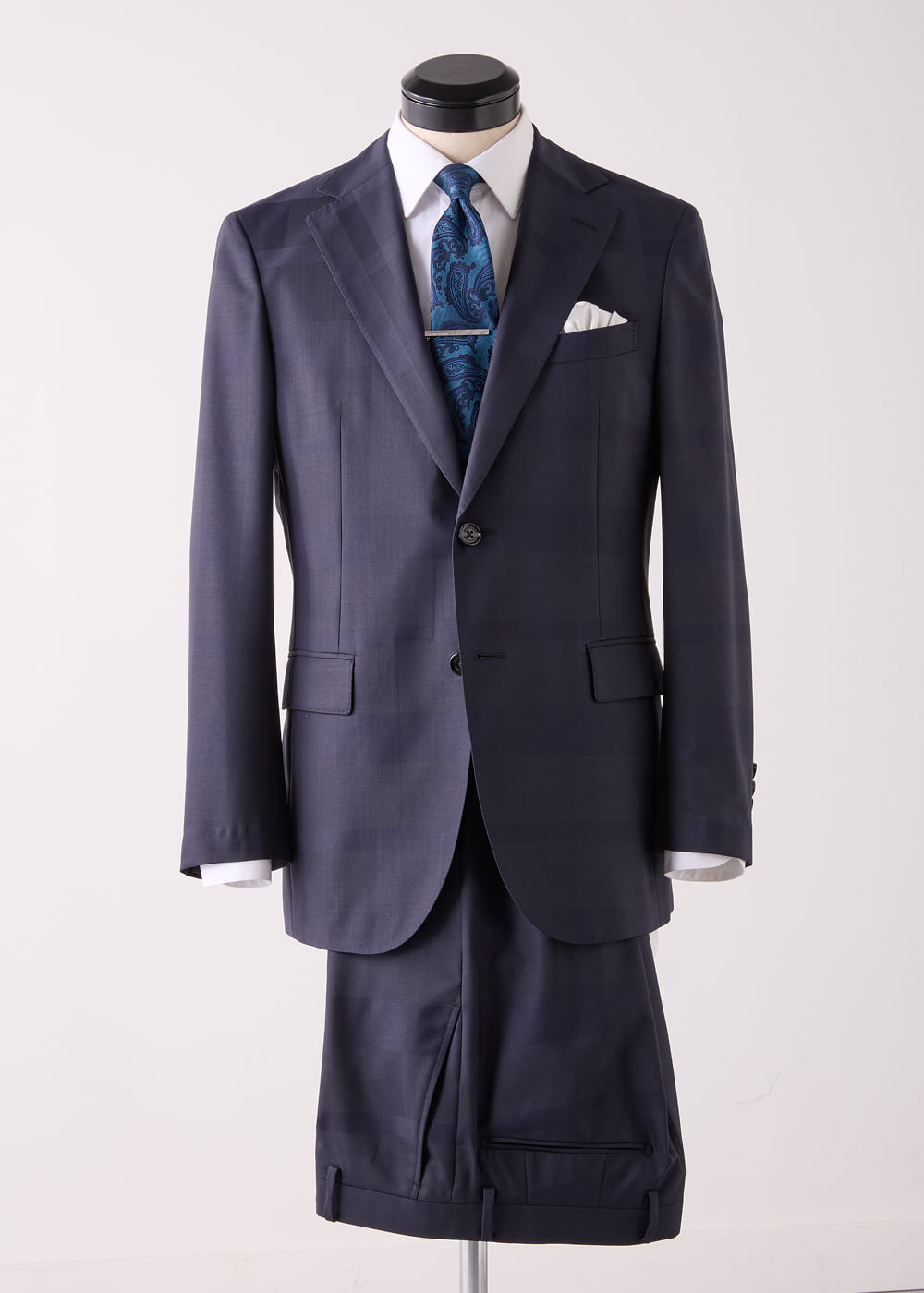 美しい光沢を湛えたネイビーカラーのセットアップ。上質な極細番手ウール混素材を使用し、シャドークレストブリッジチェック柄がさりげなく浮かび上がる。春の立ち上がりから盛夏まで着用できる軽やかな生地感に加え、ウォッシャブル仕様と高い防シワ性を兼ね備えているのも頼もしい。ピンオックスのレギュラーカラーシャツに、配色が映えるペイズリータイを合わせて。端正さの中に華やぎを添えたVゾーンは、祝祭やハレの場にふさわしい装いとして映る。