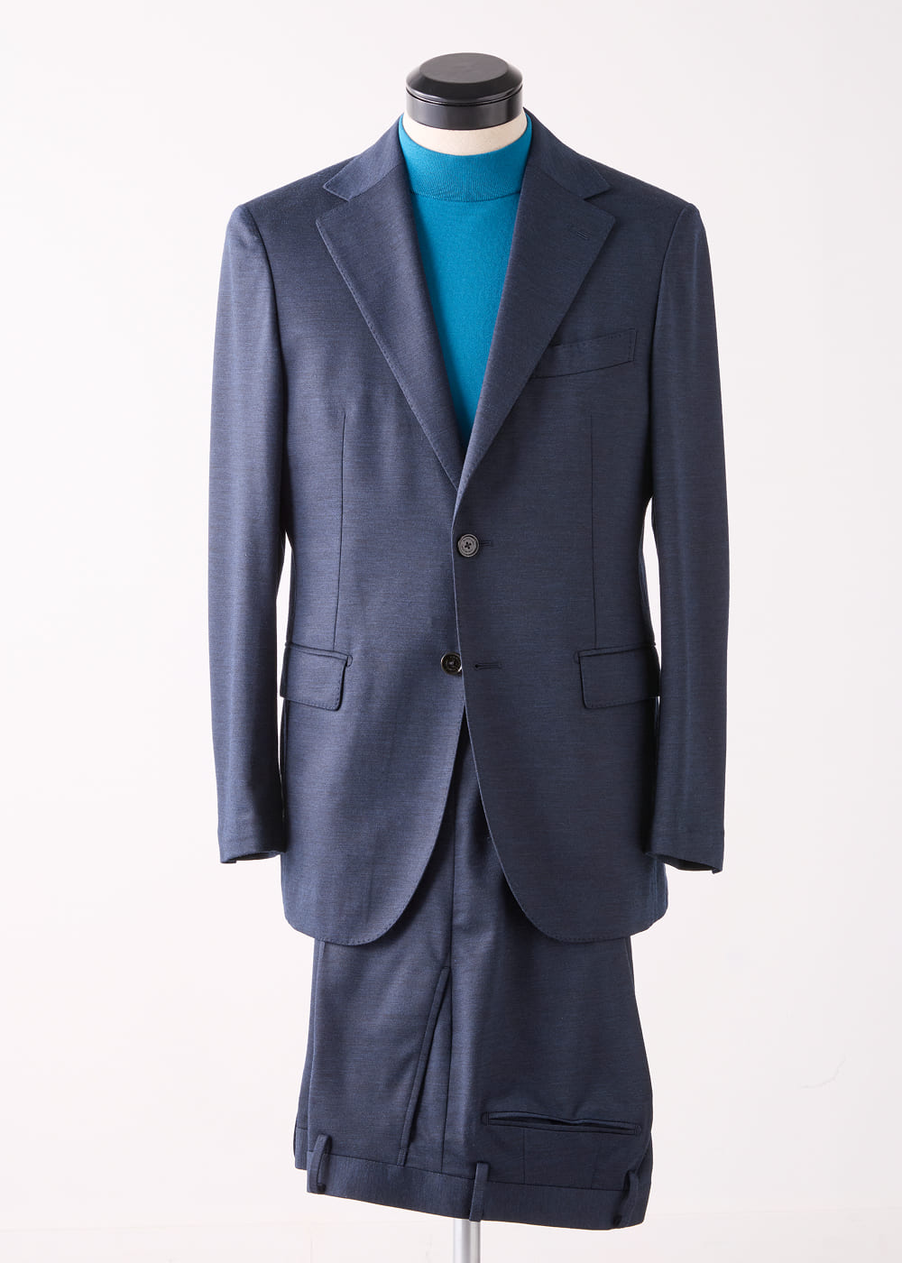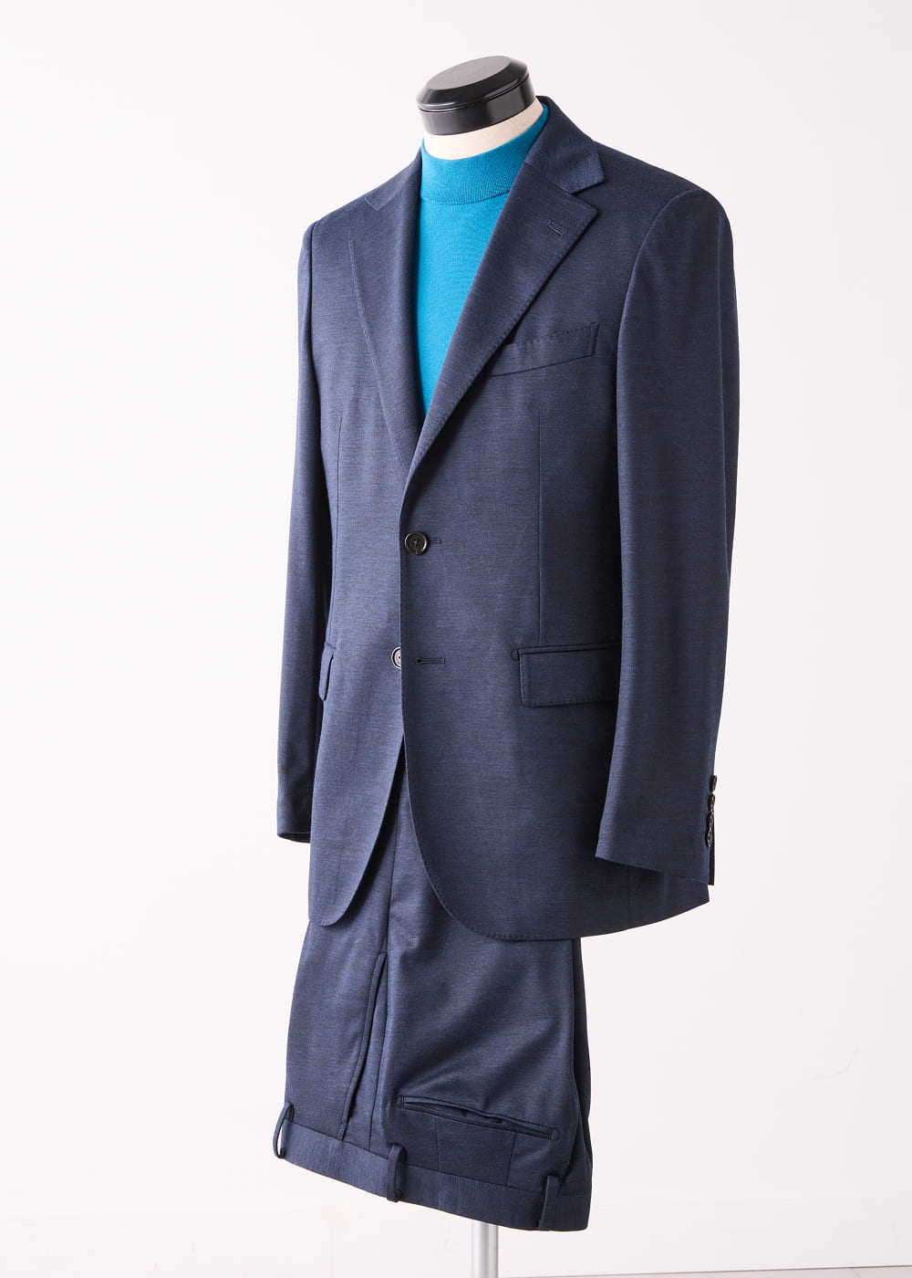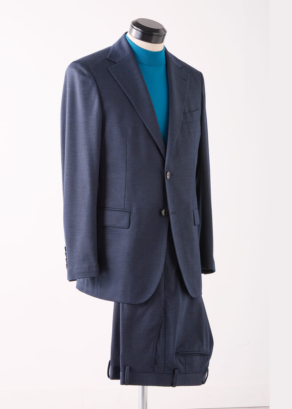 高密度に編み立てられた生地は、滑らかな表面感とシルキー加工による上品な光沢が印象的だ。ジャージーならではの伸縮性も備え、テーラードの品格と快適な着心地を両立している。セルリアンブルーが映えるモックネックニットTシャツを合わせれば、好印象と清潔感を兼ね備えたノータイスタイルが完成。肩の力を抜きながらも品格を失わない、ブリティッシュテーラリングの進化形といえる。