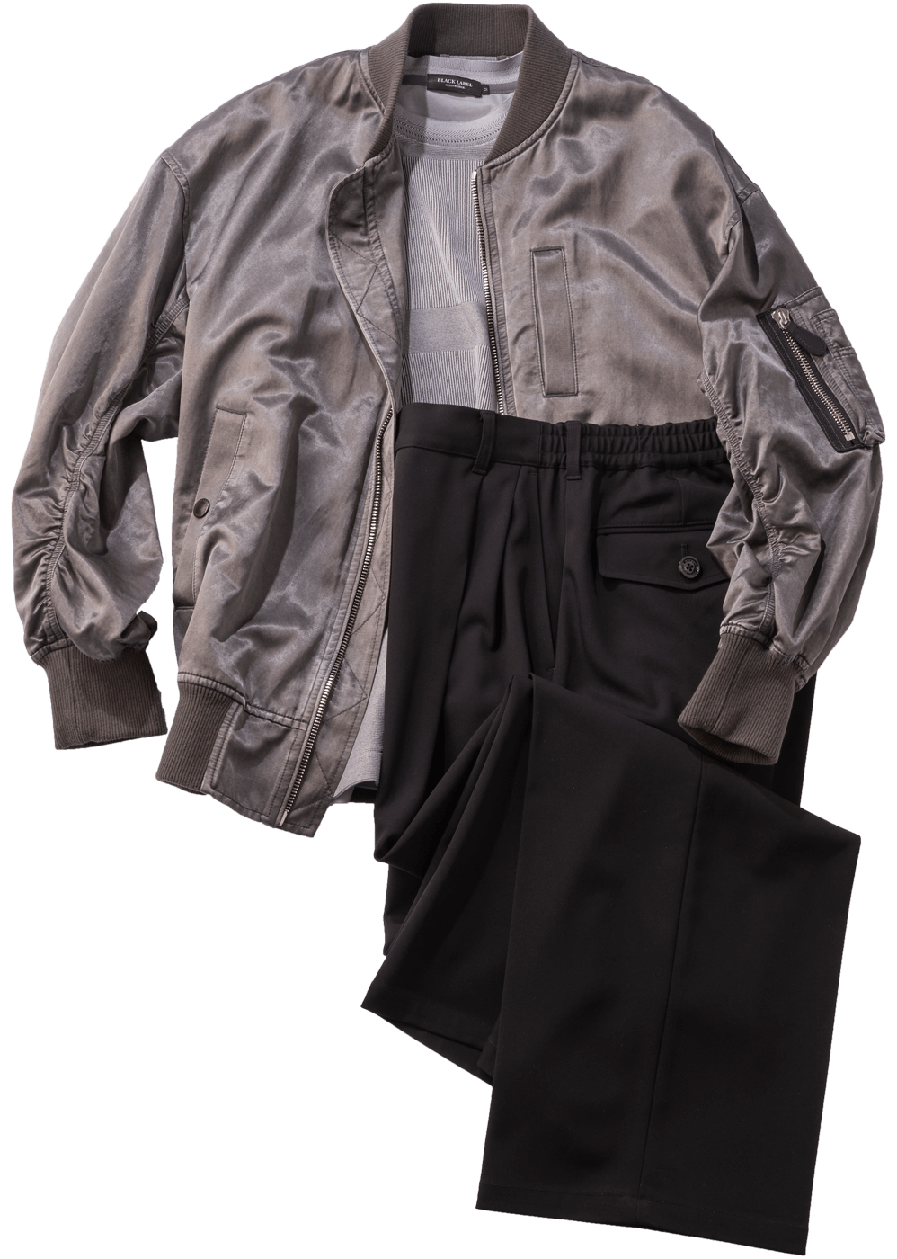 フライトジャケットの代名詞、MA-1を素材使いと加工で現代的に再構築。表地のサテン生地に顔料染色とブリーチ加工を施すことで、光沢とドレープ感を残しながらも、ムラのある奥行き豊かな表情に仕上がっている。さらに製品洗いによって、自然な色落ちと着込まれたような風合いをプラス。裏地にはクレストブリッジチェックを配し、さりげなくブランドのアイデンティティを忍ばせる。全体はゆとりのあるサイジング。袖にギャザーを加えつつ、裾と袖口をリブで引き締めることで、MA-1特有の丸みのあるシルエットを際立たせている。ユニオンジャックとブランドロゴを掛け合わせた刺繍ネームが象徴的。ヴィンテージ感と高級感が交差する、存在感ある一着だ。