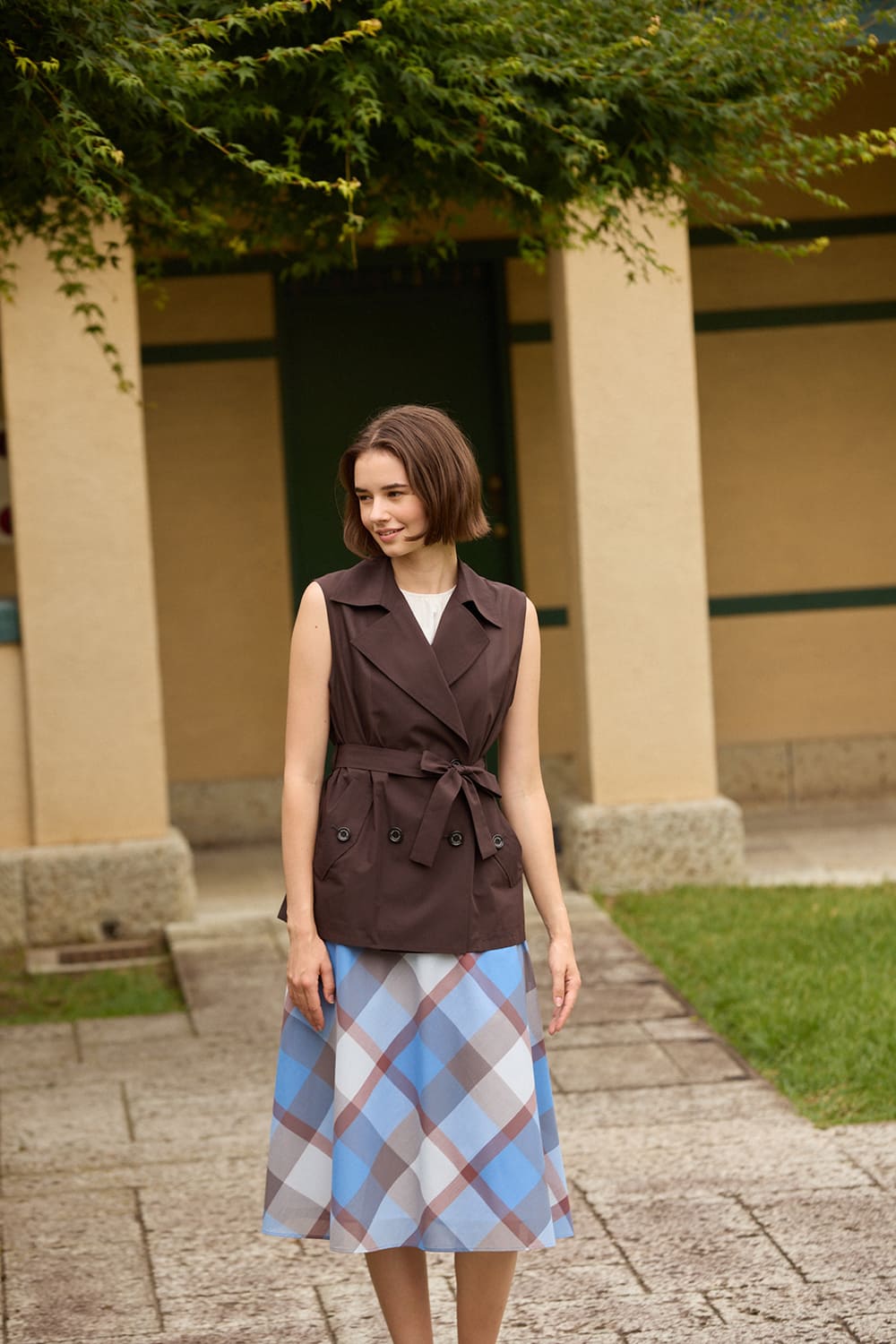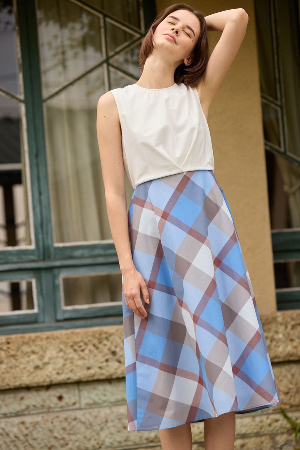 柔らかなグレージュのトップスにチェックスカートを効かせて、秋のはじまりを軽やかに装う。風をはらむ優しいチュール素材のスカートが、季節の移ろいを優しく映す。