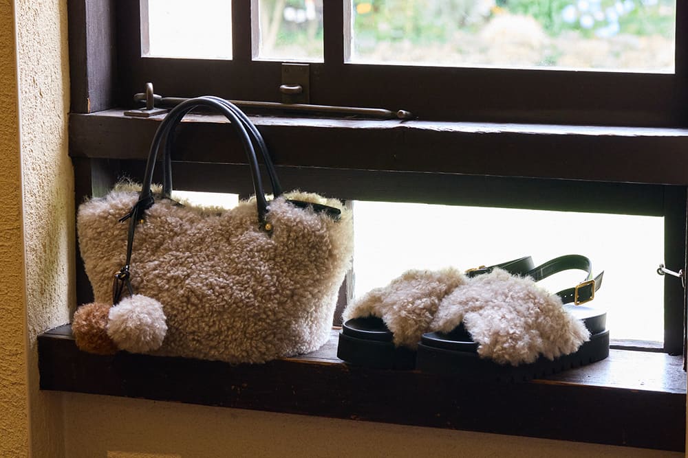 もこもこの質感が、秋の気分を優しく引き寄せる。遊び心とあたたかみを添えるファーバッグとサンダルで、足元から季節を楽しんで。