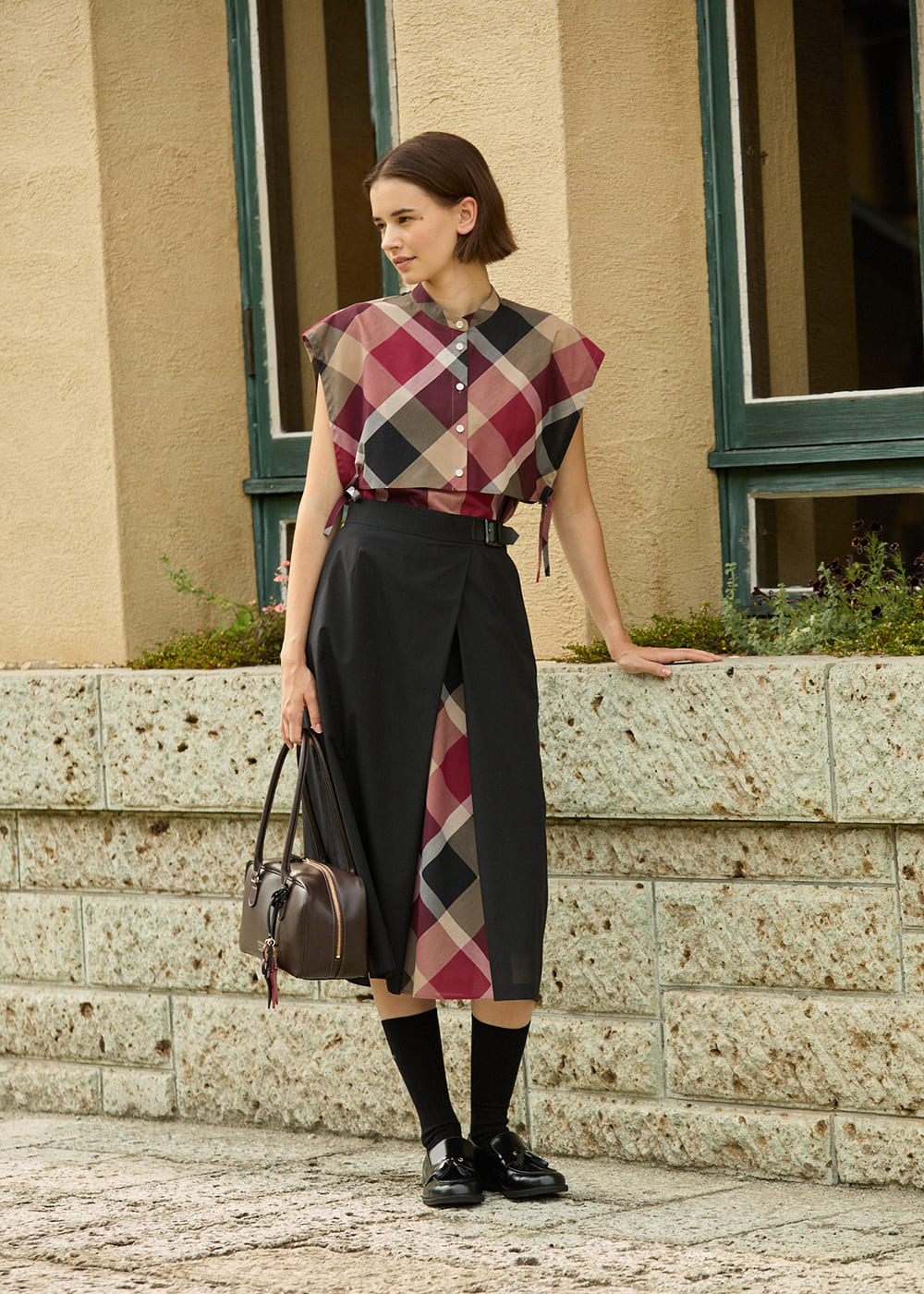 深みのあるレッド×ベージュのクレストブリッジチェックが印象的なブラウスに、上品なスカートを合わせて。柄を効かせたモードなレイヤードデザインが、知的で洗練された佇まいを演出。