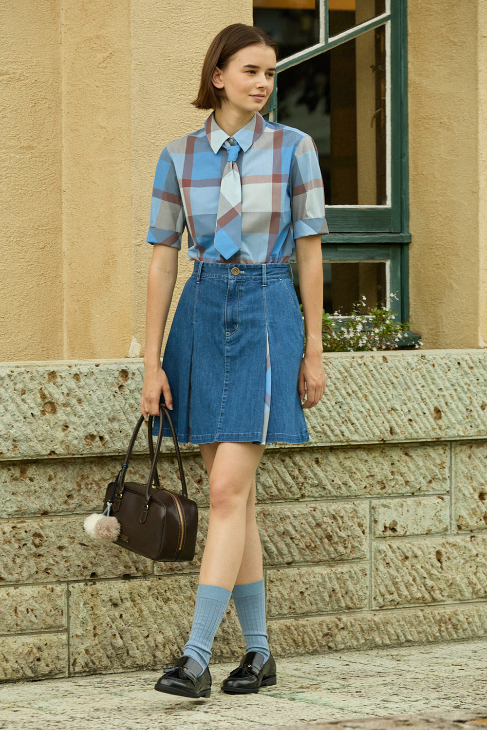 タイ付きチェックシャツにミニ丈のデニムスカートで、大人のプレッピースタイルが完成。アクセントのレザーバッグでエレガンスを誘って。