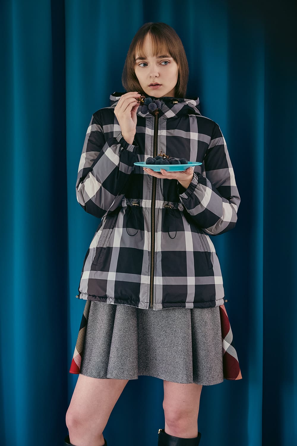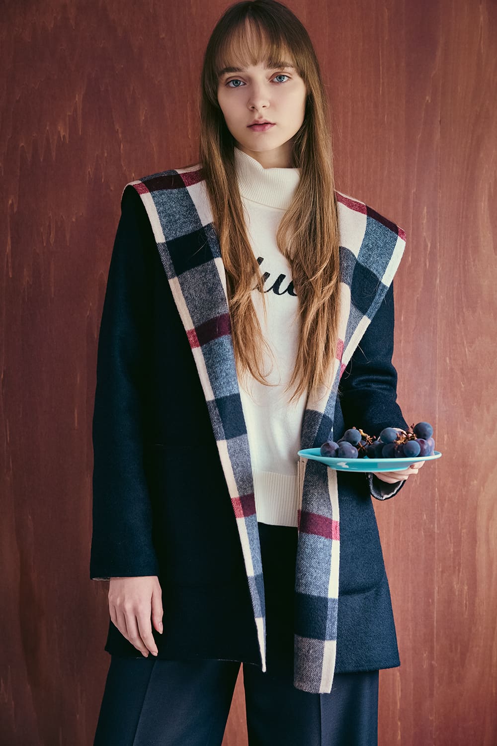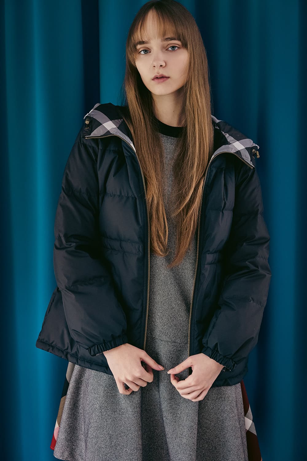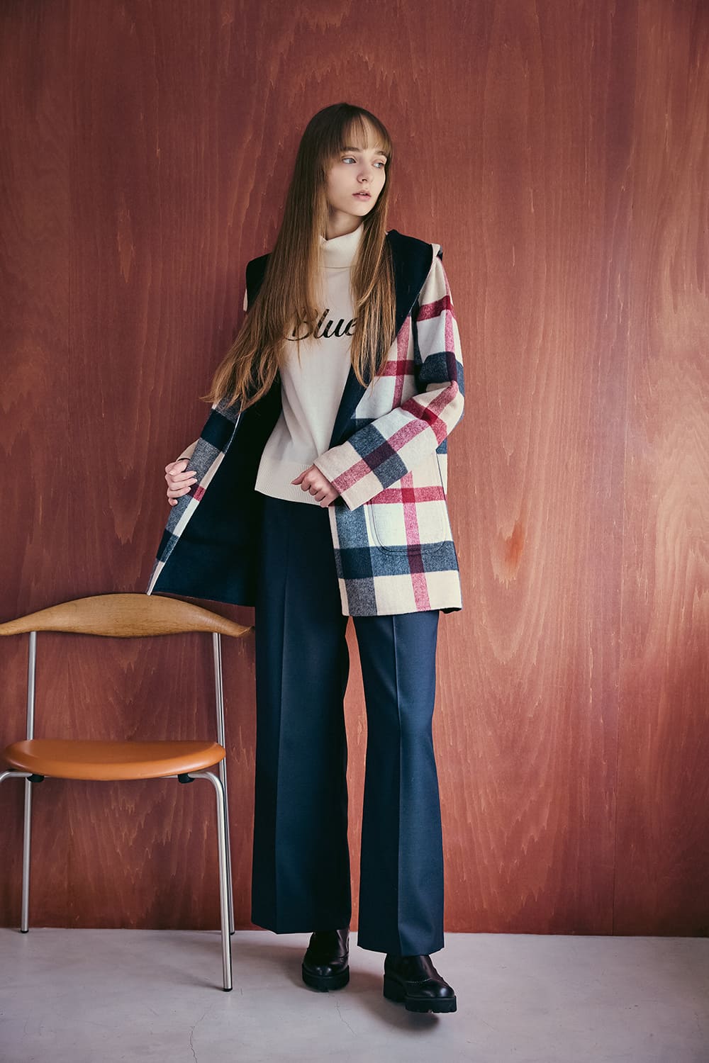 カーディガン感覚で気負わず羽織れるコートは、クレストブリッジチェックと単色のリバーシブル仕様。