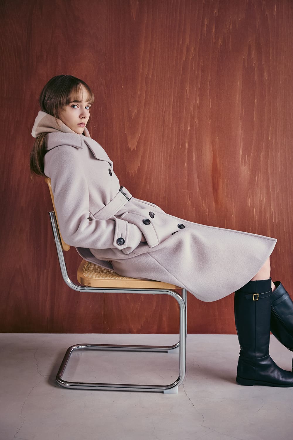 正統派ディテールを詰め込んだハンサムなウールコートは、くすみカラーで愛らしさを加えて。