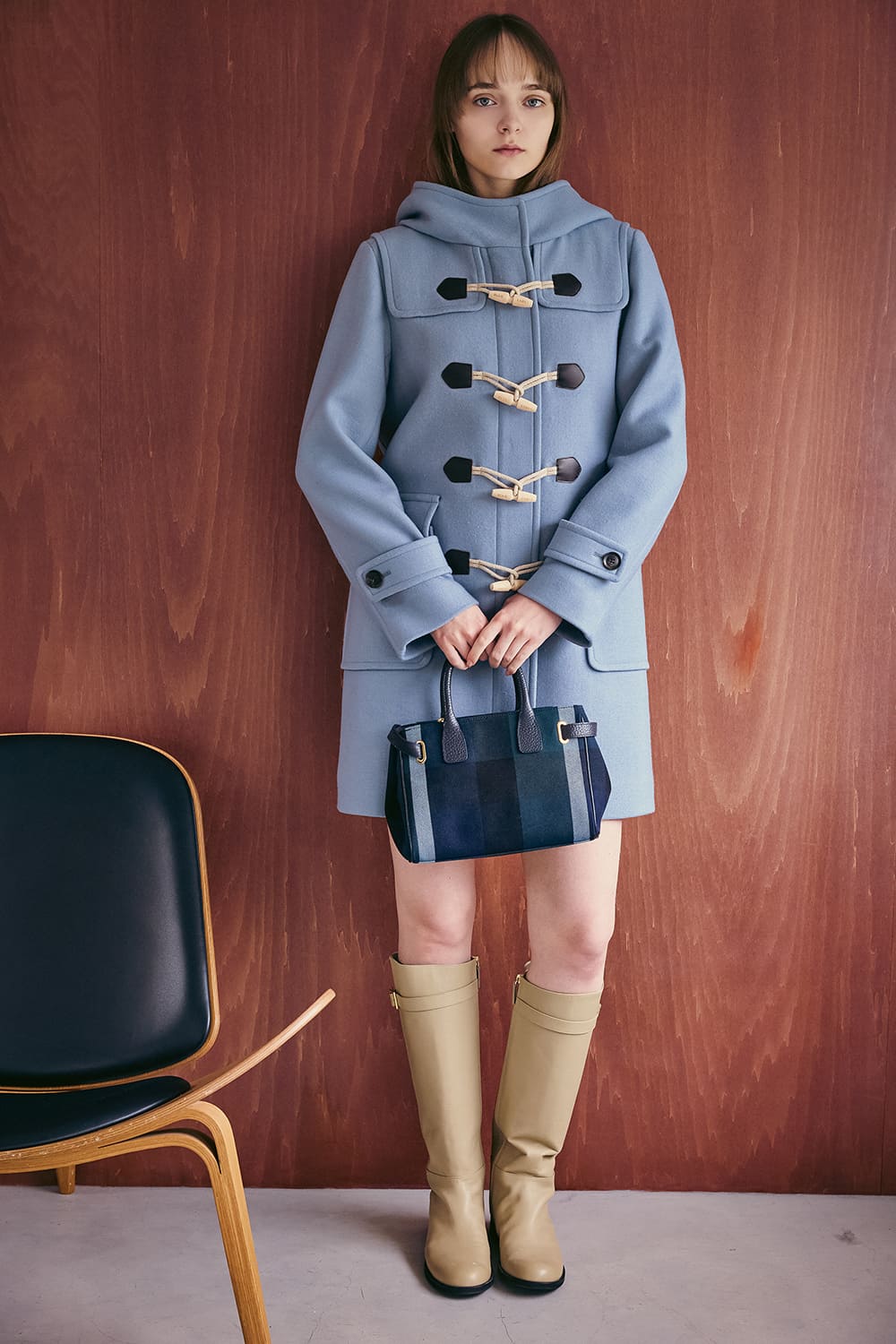 空気が澄み渡る冬の空に映えるのは、スカイブルーのダッフルコート。上質なウールと仕立ての良さが際立つデザインがこの冬の相棒に。ベージュのロングブーツでクラシカルなスタイルが完成する。
