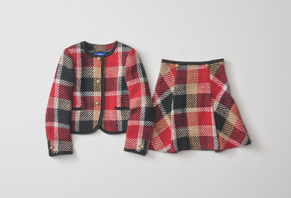 ツイード素材のジャケットとスカートもウールマーク認証アイテム。