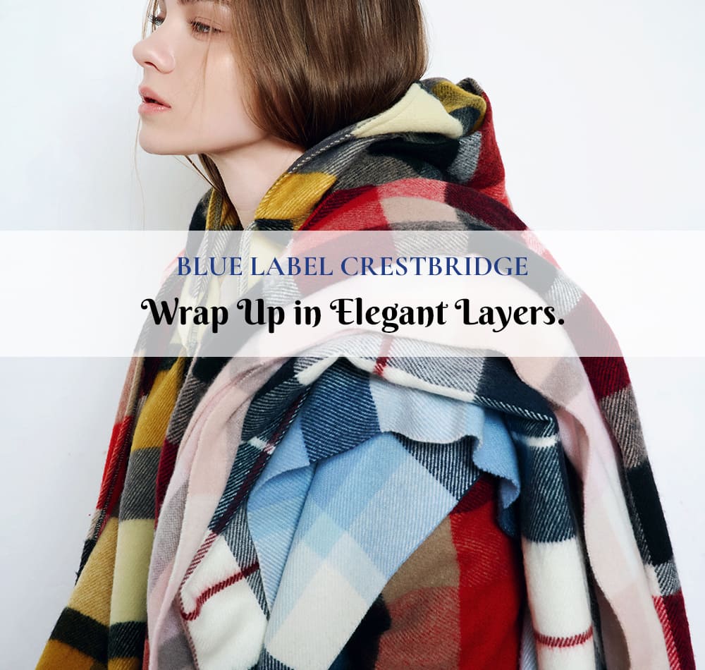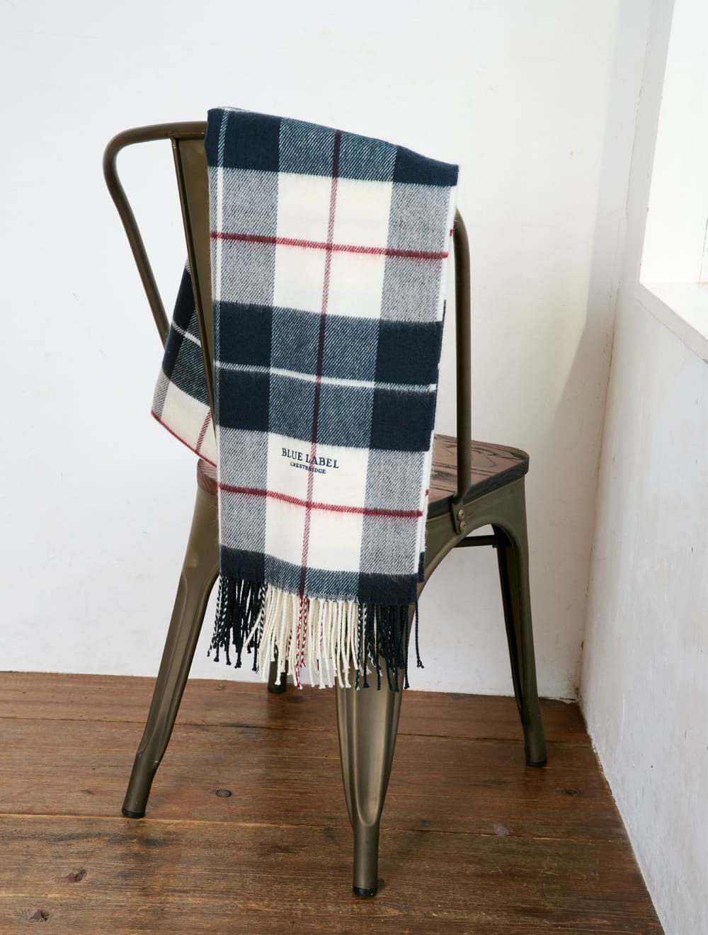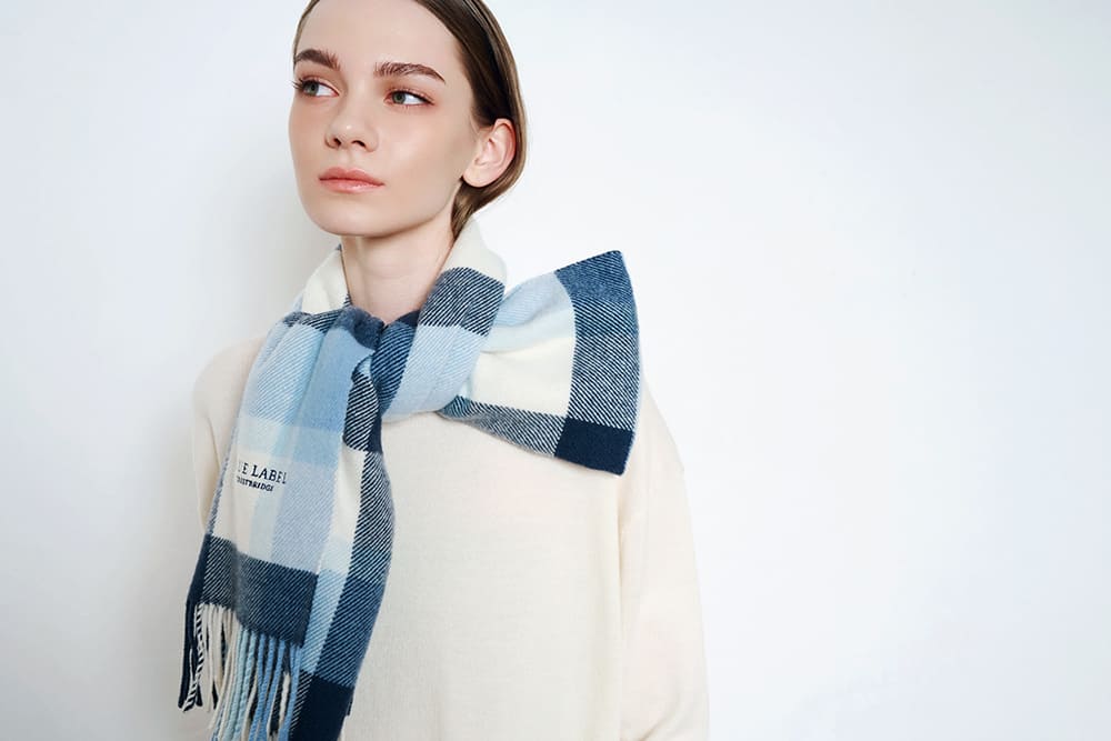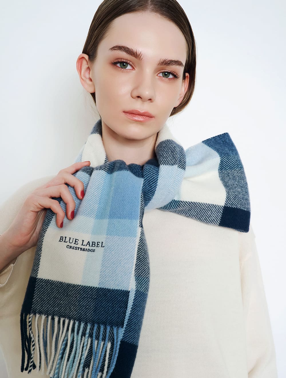 上質な肌触りが魅⼒のアクリルチェックストール。ブルーレーベルのシーズンカラーで構成したチェックが印象的です。おすすめは、防寒性と華やかさを兼ね備えた⼆重巻き。くるくると巻くだけでほどよいボリュームが⽣まれ、⾸元を暖かく、顔まわりを明るく⾒せてくれます。