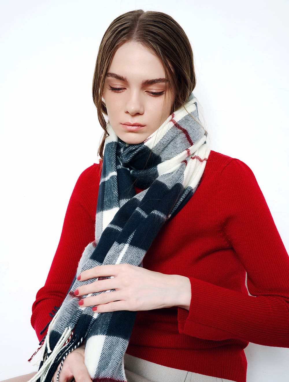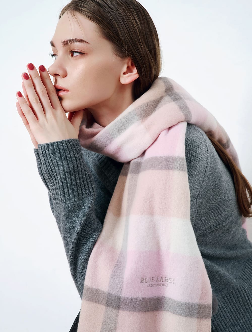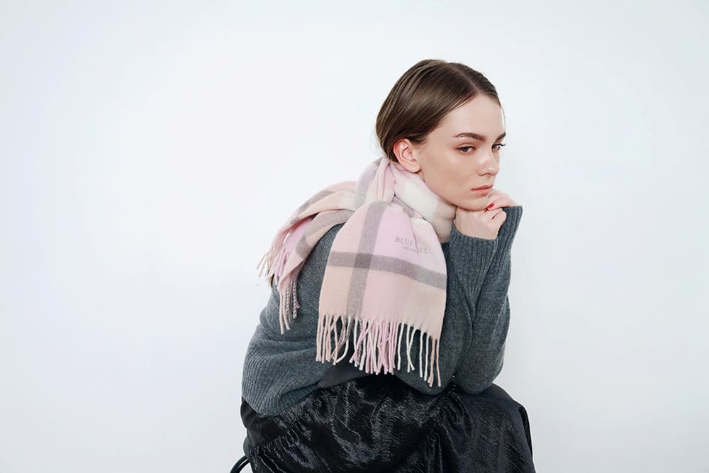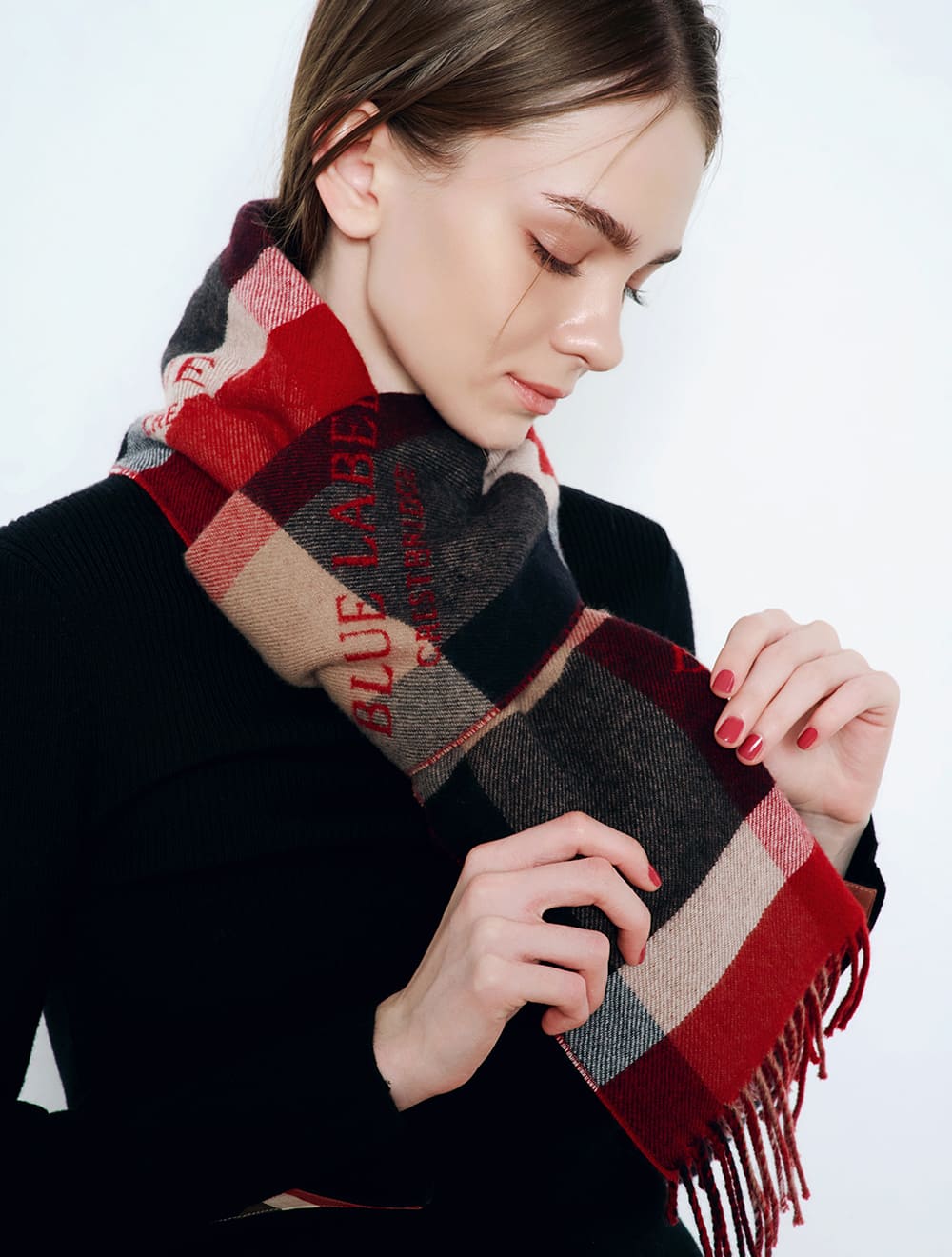 上質な肌触りが魅⼒のアクリルチェックストール。ブルーレーベルのシーズンカラーで構成したチェックが印象的です。おすすめは、防寒性と華やかさを兼ね備えた⼆重巻き。くるくると巻くだけでほどよいボリュームが⽣まれ、⾸元を暖かく、顔まわりを明るく⾒せてくれます。