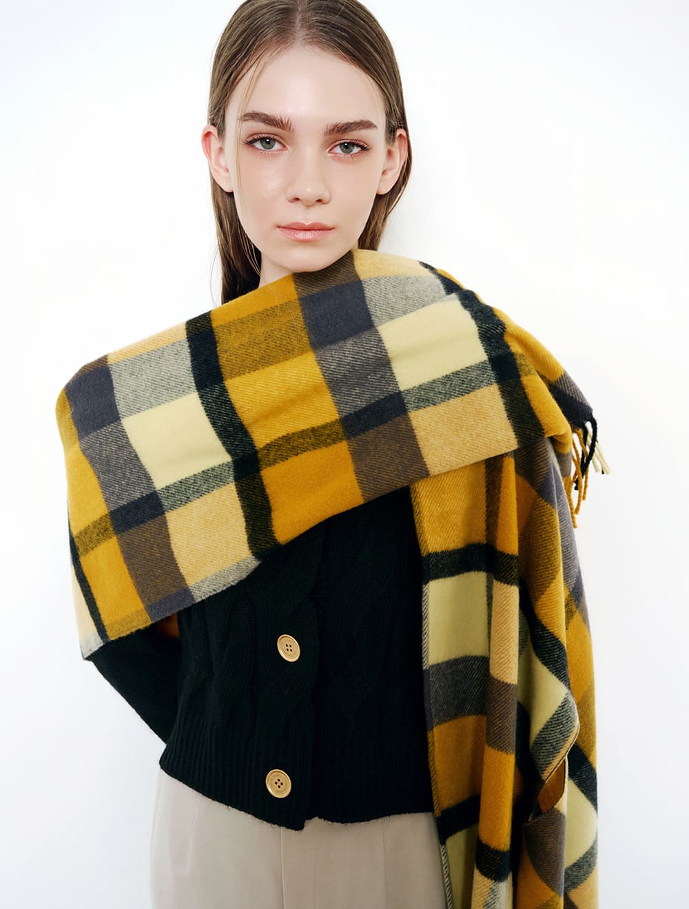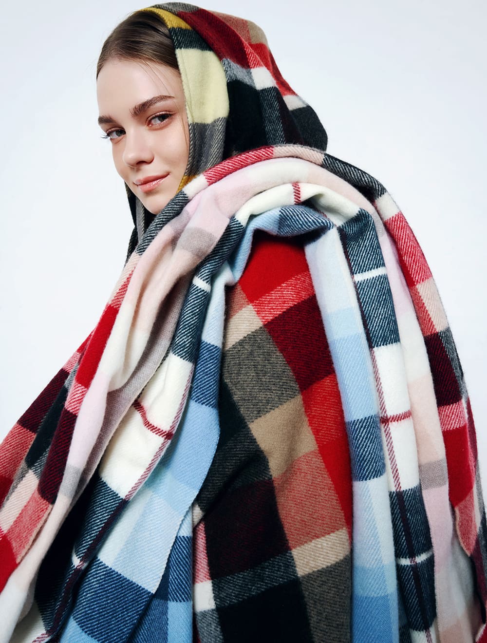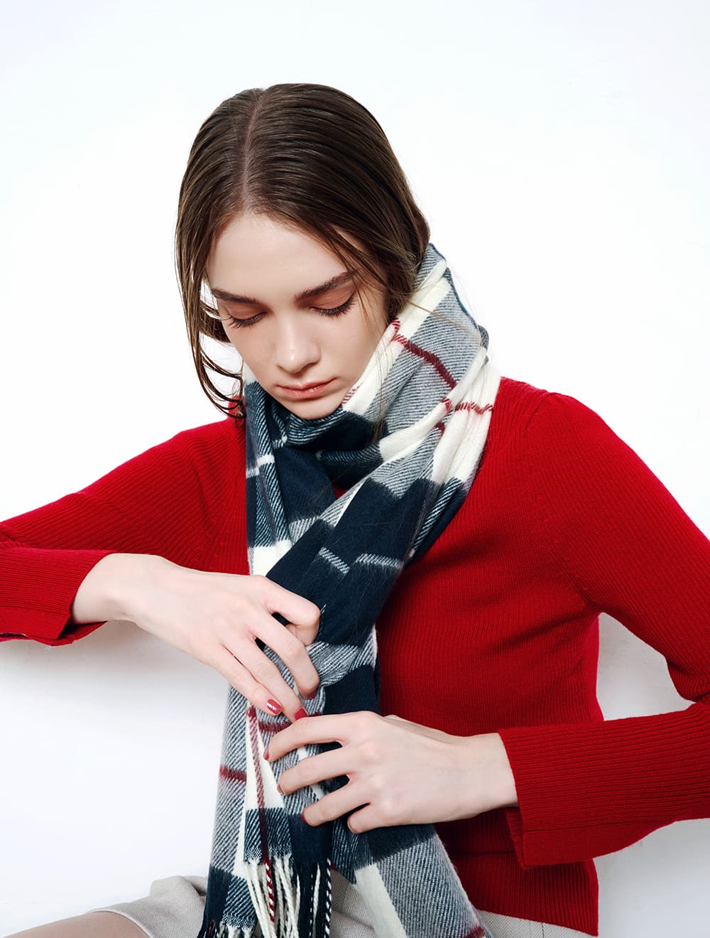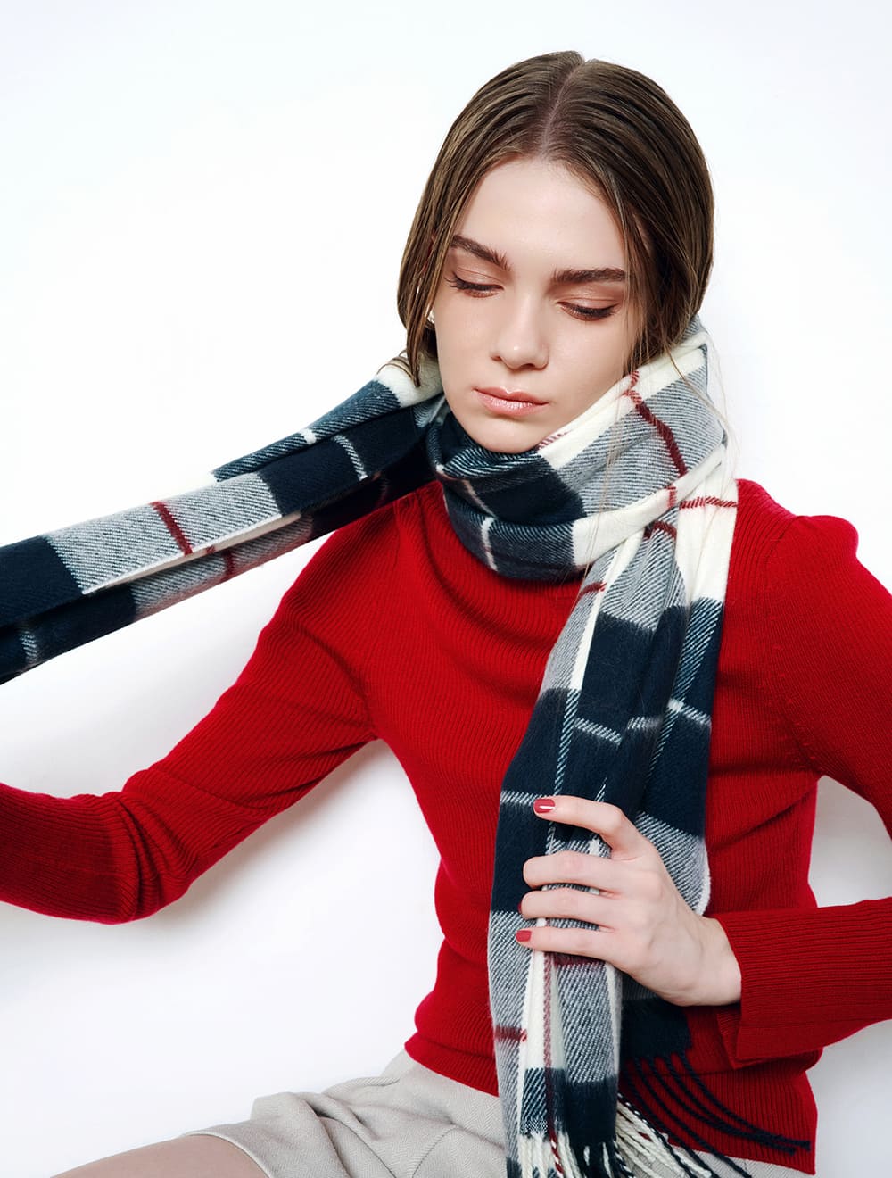上質な肌触りが魅⼒のアクリルチェックストール。ブルーレーベルのシーズンカラーで構成したチェックが印象的です。おすすめは、防寒性と華やかさを兼ね備えた⼆重巻き。くるくると巻くだけでほどよいボリュームが⽣まれ、⾸元を暖かく、顔まわりを明るく⾒せてくれます。