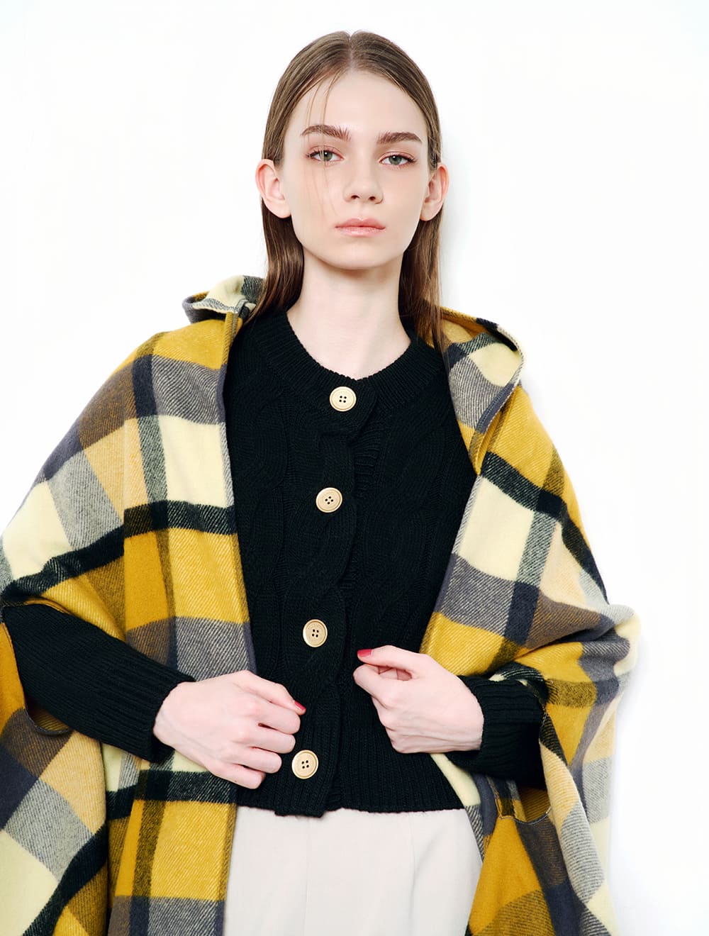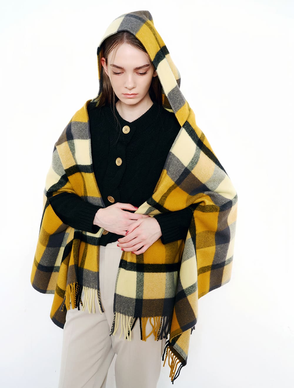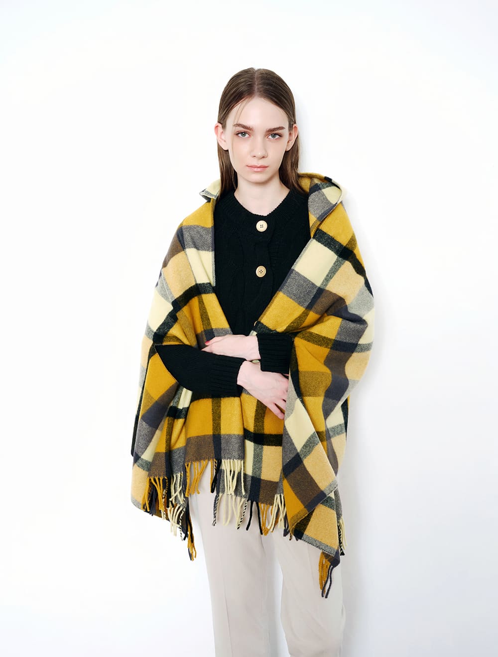 初冬にぴったりな、ポンチョタイプのフード付きストール。⽻織るだけで、コーディネートに抜け感と温もりをプラス。フード付きのデザインが顔まわりを華やかに⾒せ、スリット⼊りで両⼿も⾃由に使えます。巻き⽅や⽻織り⽅を変えるだけで、印象を⾃在にアレンジできるのも魅⼒。冬⽀度を始めるこの季節、⼀枚あると⼼強いアイテムです。