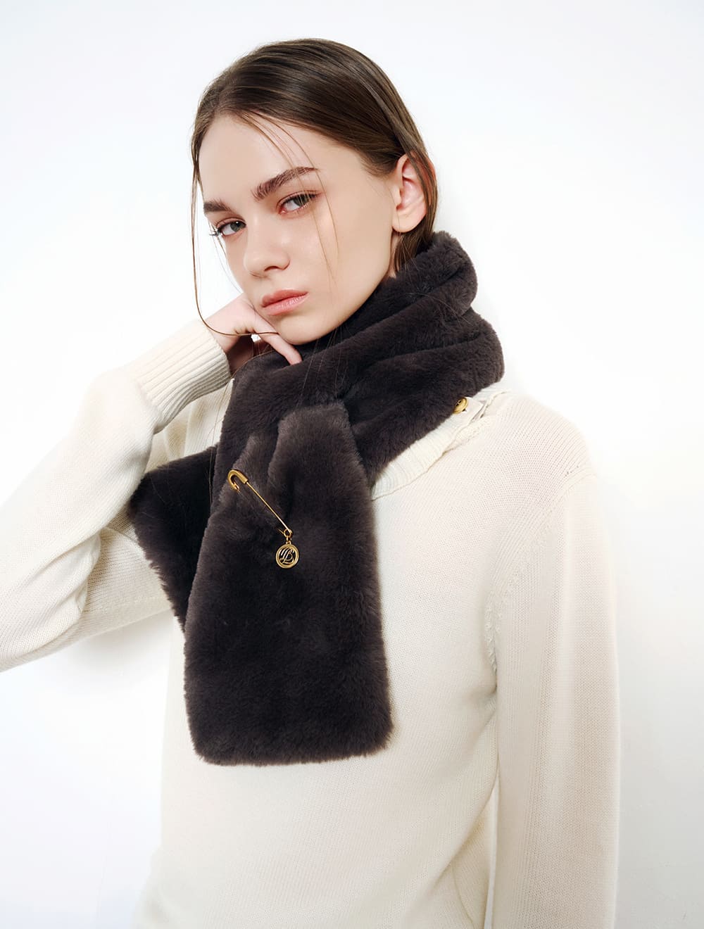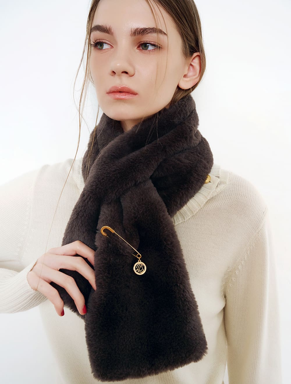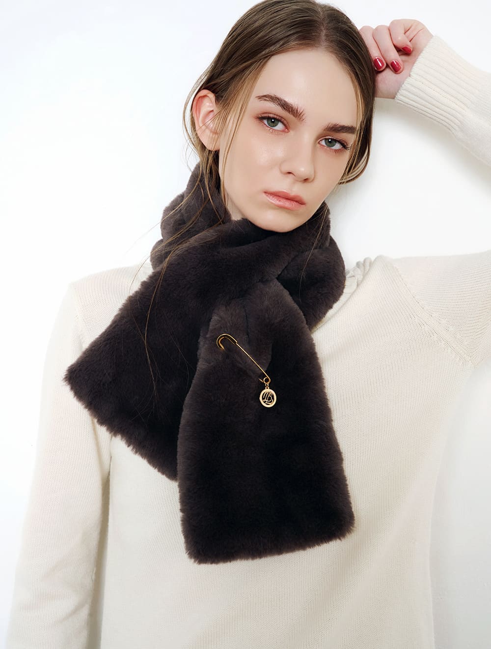 顔まわりを華やかに彩るフェイクファーティペット。ふんわりとしたフェイクファーの質感に、裏地のクレストブリッジチェックがさりげなく映えるデザインです。⾸元に差し込むだけで簡単に着けられる仕様で、忙しい朝も⼿早くスタイリングが完成。キルトピンのきらめきがワンポイントとなり、冬の装いに上品なアクセントを添えます。巻き⽅はさし込むだけのシンプルなワンスタイル。どんな⾓度から⾒ても美しく決まるよう計算されたデザインで、⼿軽さと華やかさを両⽴した優秀アイテムです。
