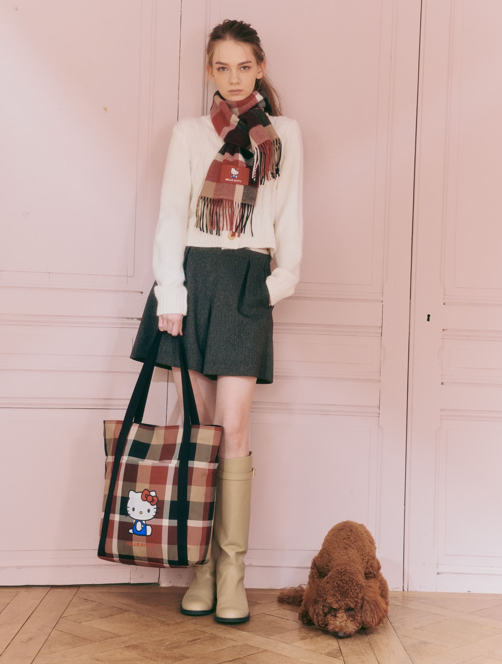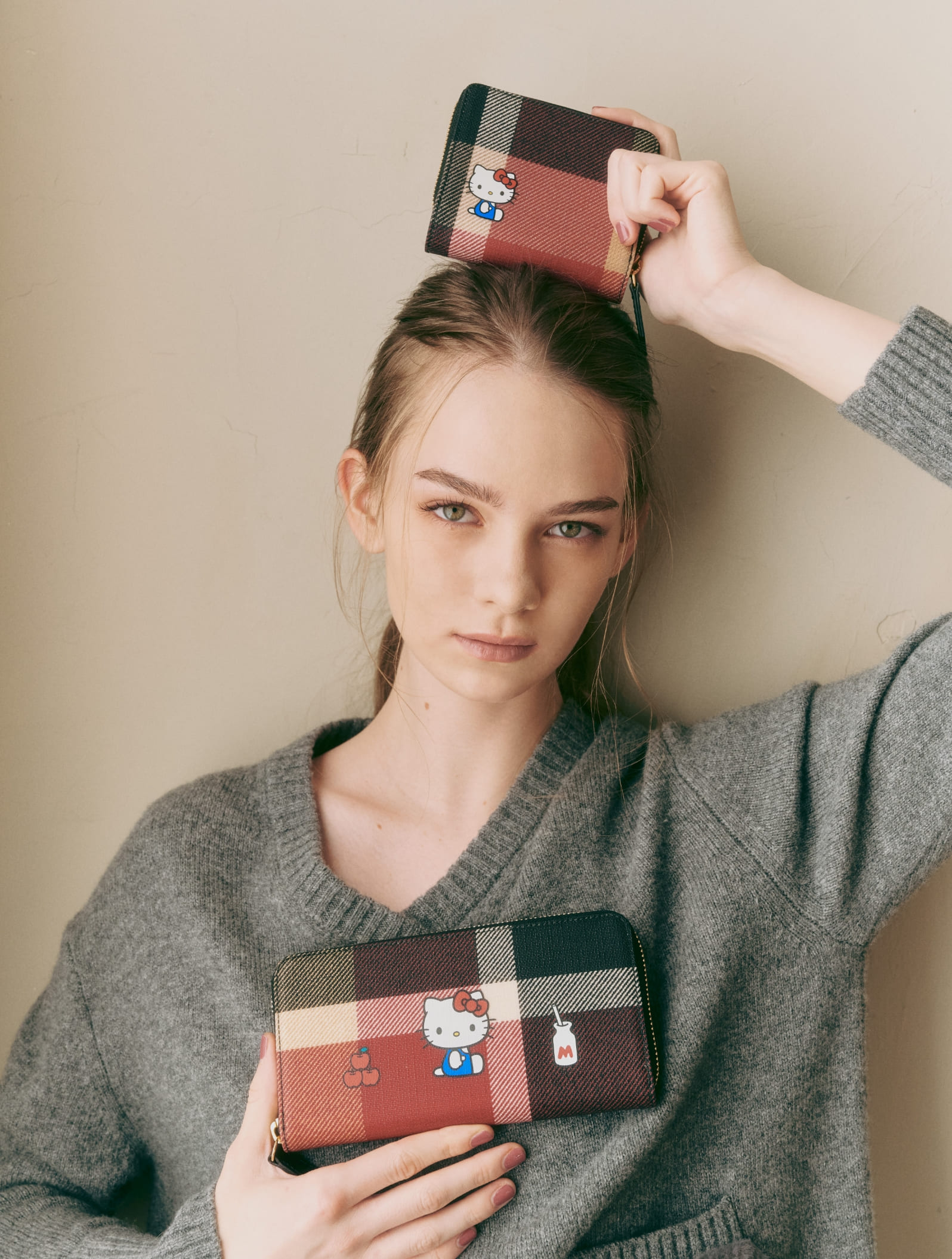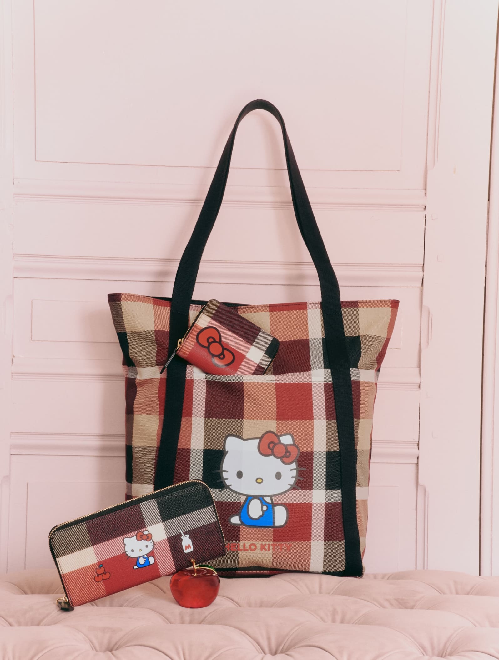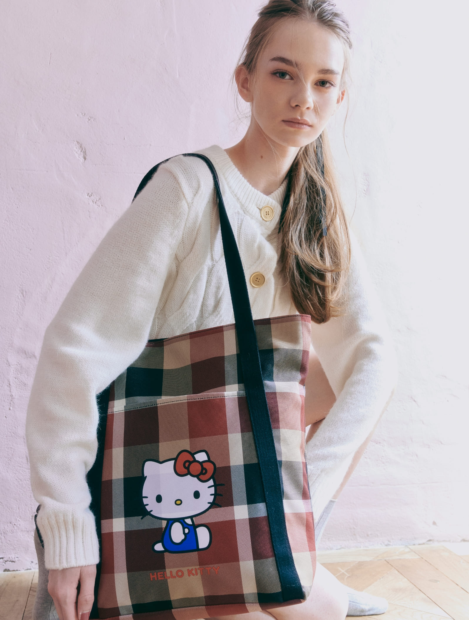 クラシカルなチェックに映えるハローキティのモチーフ。