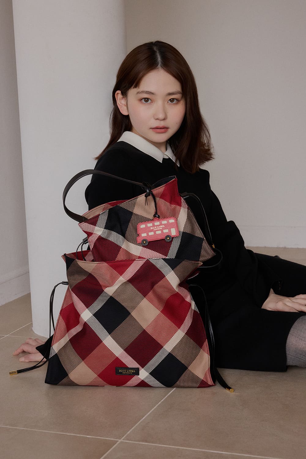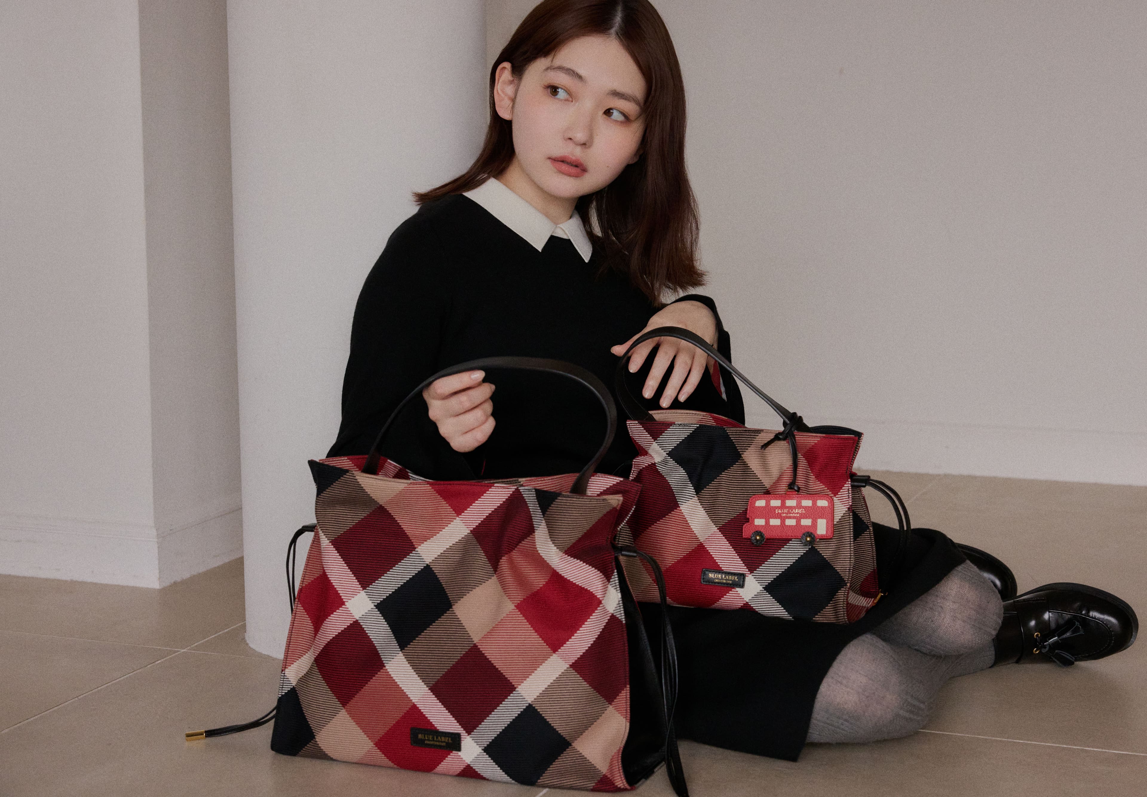 英国ムードを反映したトラディショナルなバッグには、ロンドンバスのチャームで愛らしさを添えて。目的別にサイズ違いを揃えてもGOOD。
