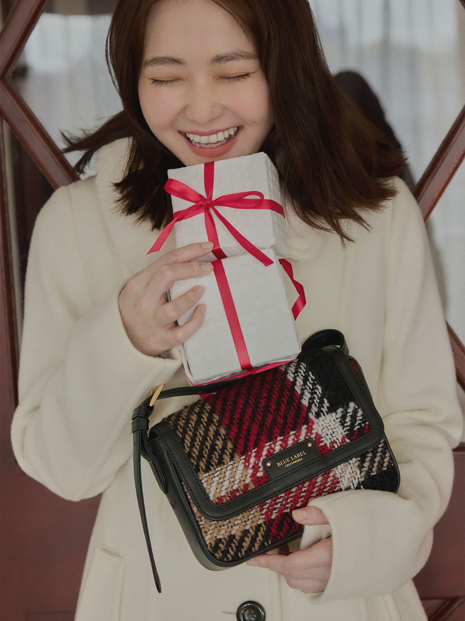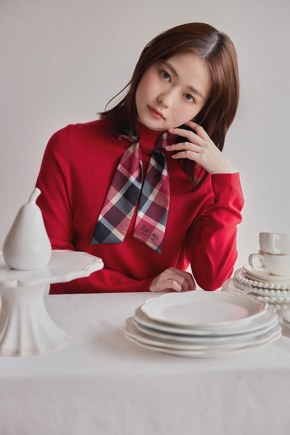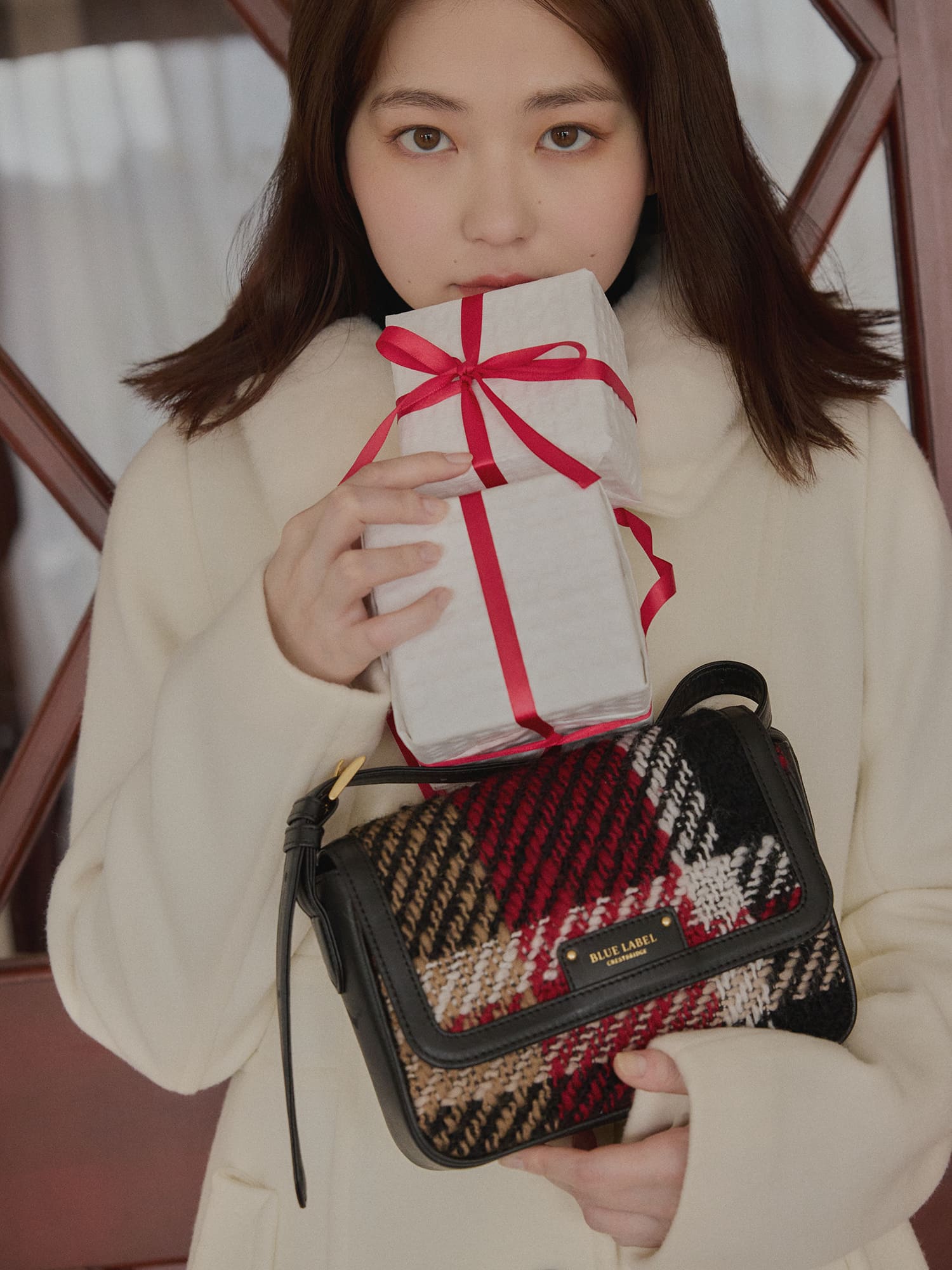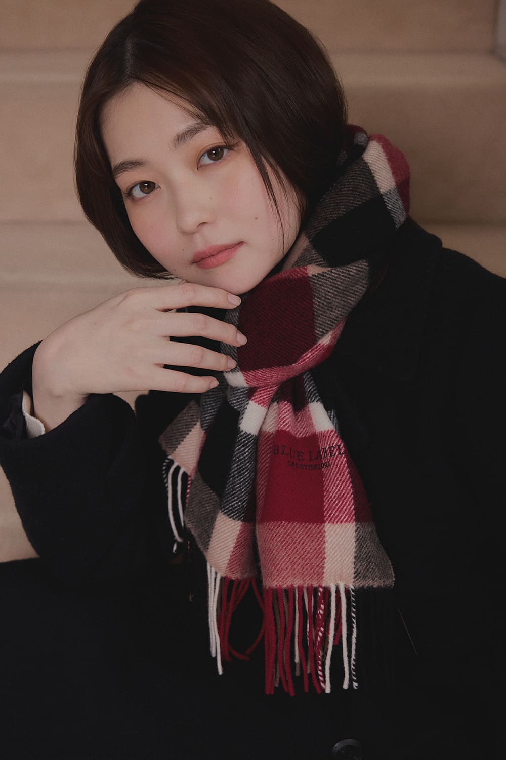 俳優の山田杏奈がブルーレーベル・クレストブリッジと過ごす聖なる日。エレガントなクレストブリッジチェックに囲まれて、山田杏奈のノーブルな個性がさらに輝く。