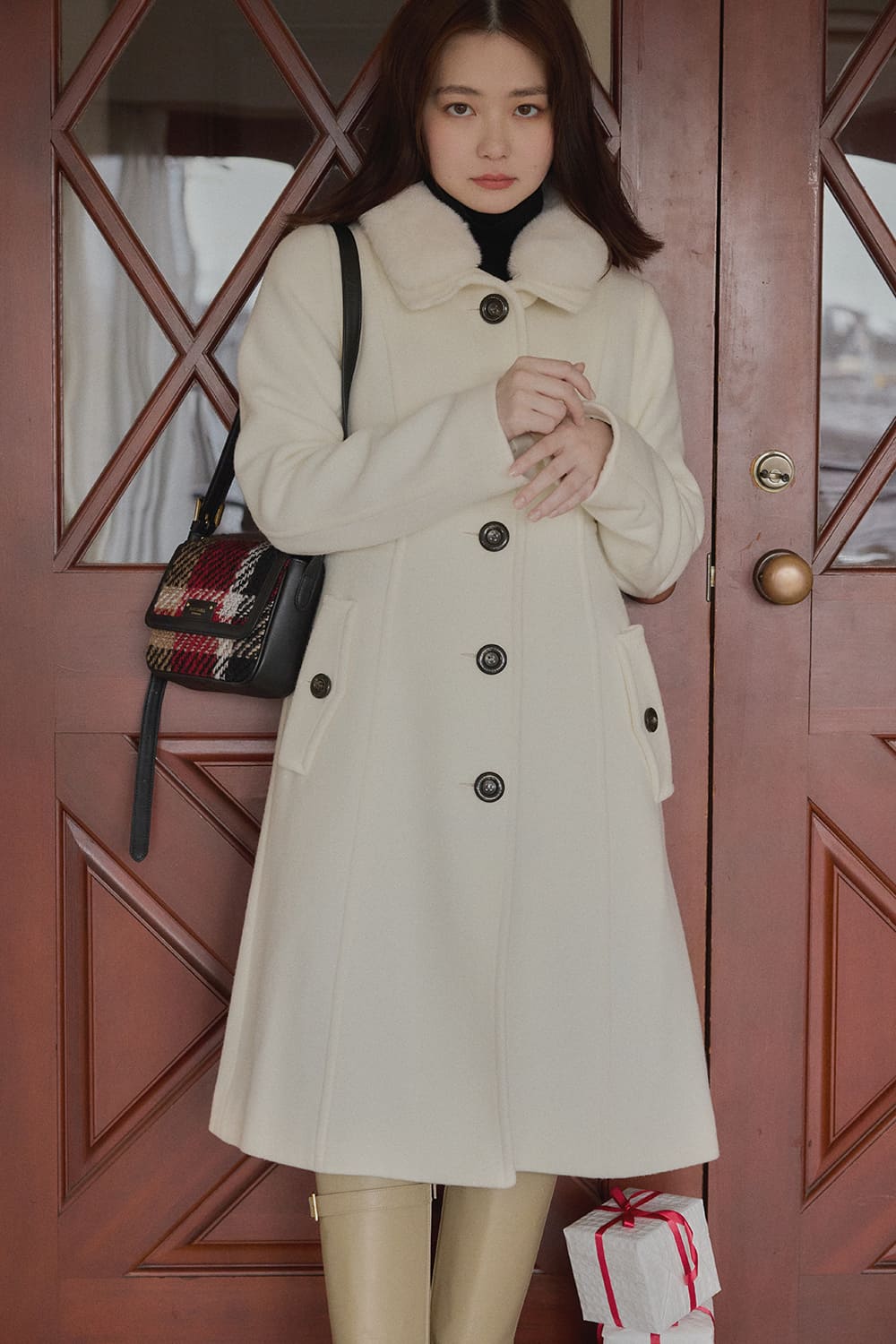 ピュアネスを引き立てるホワイトコートで、今年1年頑張った自分へのご褒美を買いに。上品なAラインとファーの襟のコートが、1日をシネマティックに彩る。