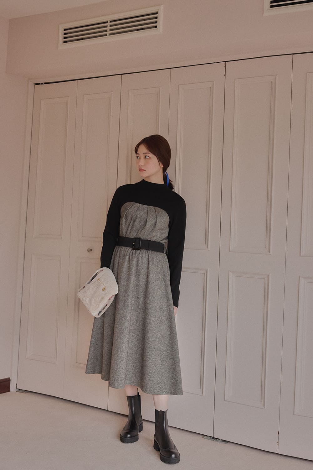 華やかなシーンにぴったりなドッキングドレス。モノトーンでもフェミニニティが香る1枚を纏い、温かなホリデーシーズンを過ごそう。
