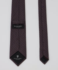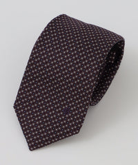 シルク100%を使用したマイクロ小紋タイ。深みのある配色の小紋柄がVゾーンにアクセントを与えます。裏地にはジャカードで表現したブランドロゴを配置し、細部までこだわった逸品です。