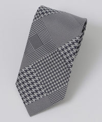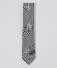 シルク100%を使用したチェックタイ。異なるデザインをつなぎ合わせる事でVゾーンにに華やかさを与えます。インポート素材(イタリア)ならではの美しい光沢が特徴的なネクタイです。裏地にはジャカードで表現したブランドロゴを配置し、細部までこだわった逸品です。