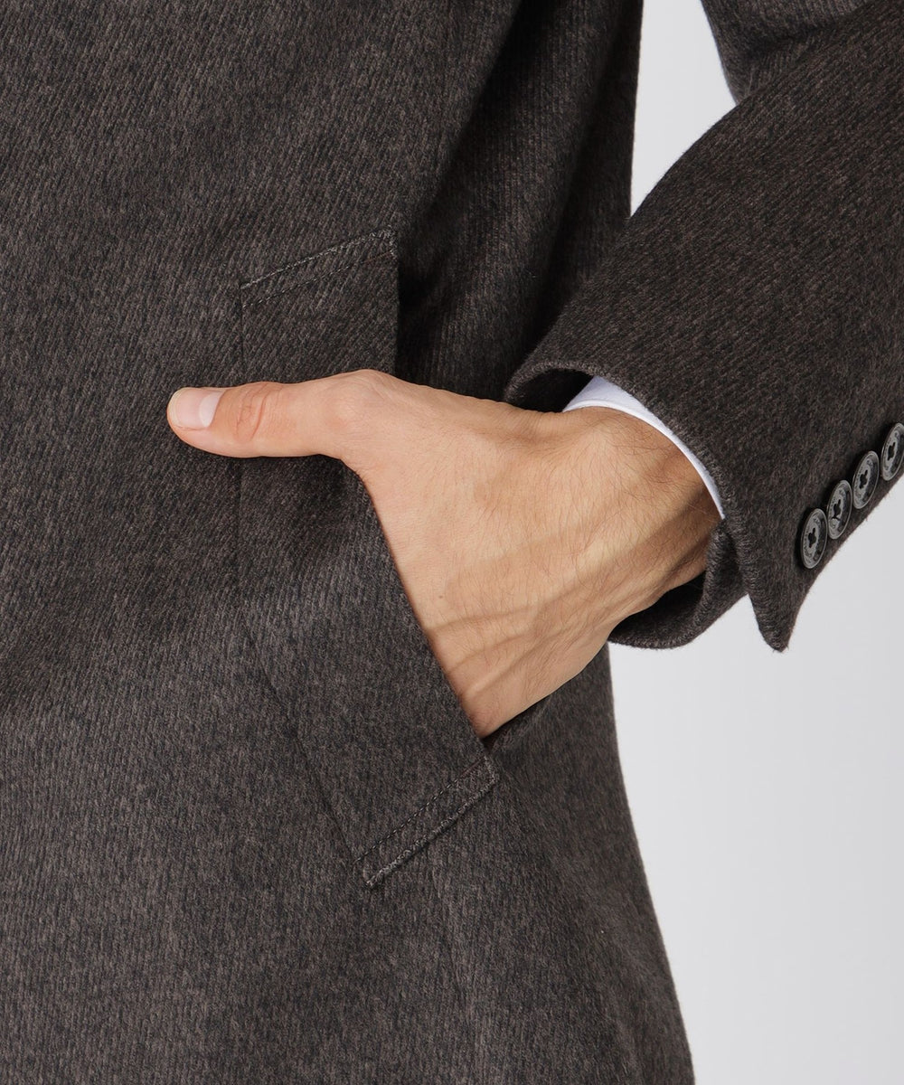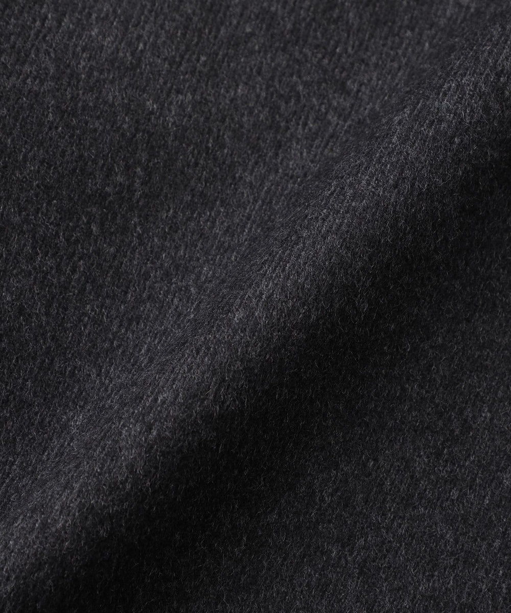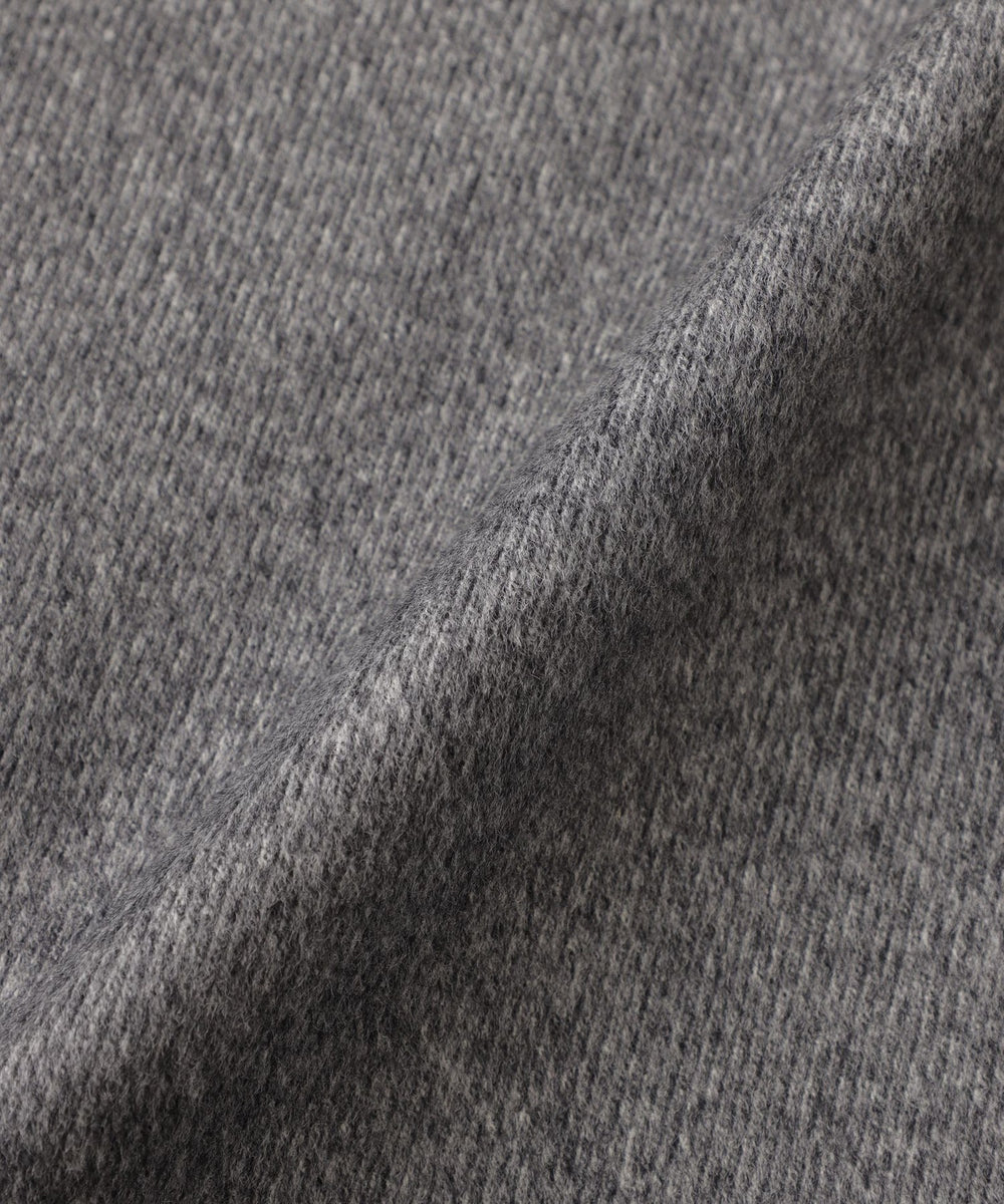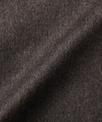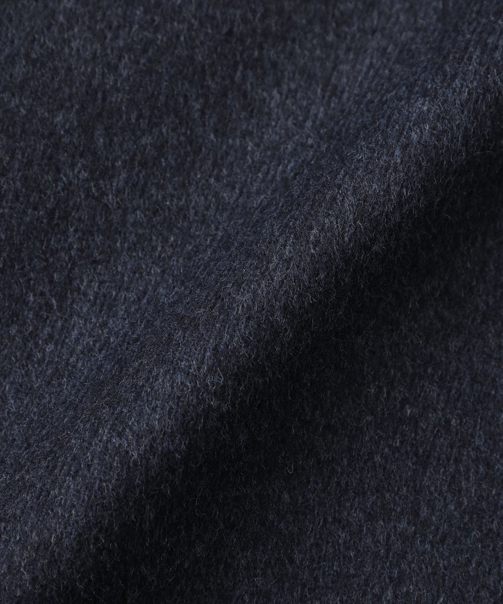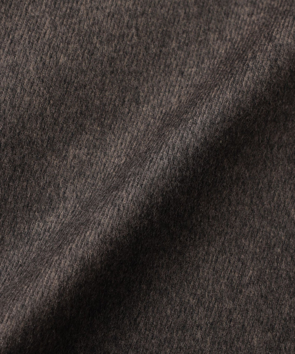 細番手の梳毛糸と太番手の紡毛糸を組み合わせることで深みのある色と立体的な表情を生み出し、繊細な起毛加工を施すことによって上質な光沢感となめらかな肌触りが特徴の素材に仕上げています。