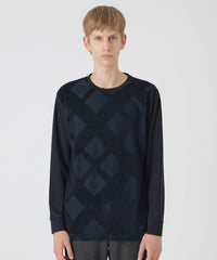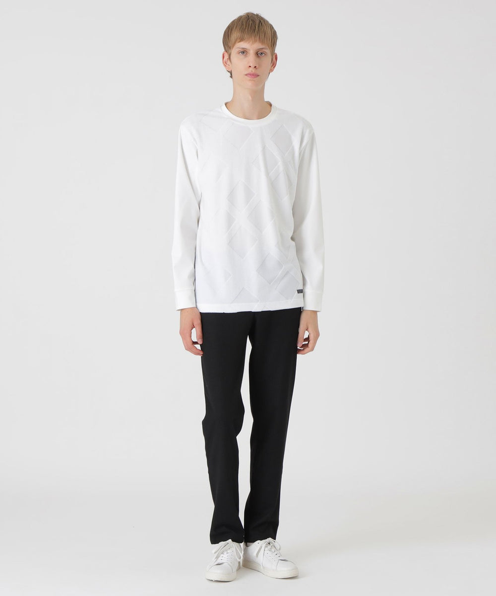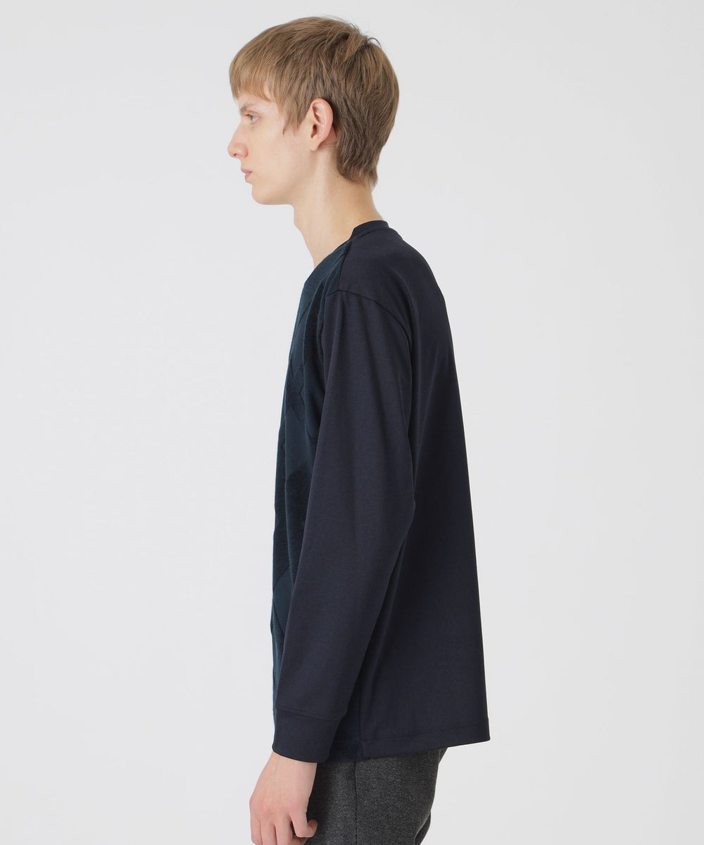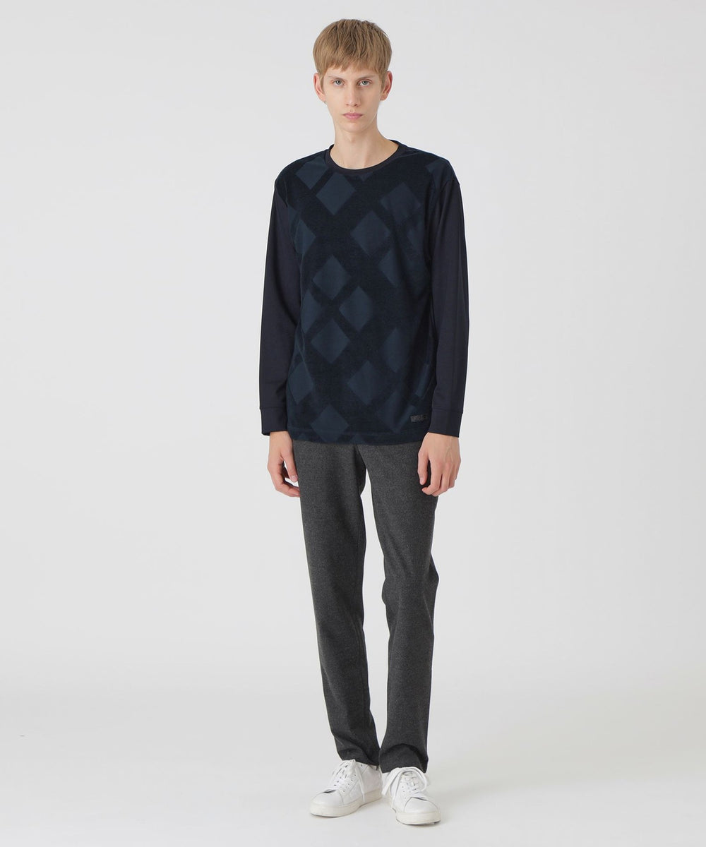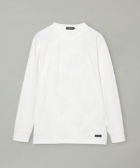 フロントにシャドーチェックをあしらった長袖カットソー。パイルによる凹凸のみでチェック柄を表現する事で、程良い存在感に仕上げています。コーディネートしやすく、一枚でも十分サマになる着回し力抜群の一着です。