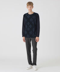 素材にはシャドーのクレストブリッジチェック柄をジャカードで表現したパイル生地をフロントに使用。ハイゲージの編み機で編み立てることで薄手のパイルに仕上げた程良い肉感が特徴です。袖と後身頃には、ストレッチ性の高いポンチ生地を使用。ハイゲージで編み上げる事で、ポンチ特有のボタつきを抑え、上品でシャープな見映えを作り出しています。