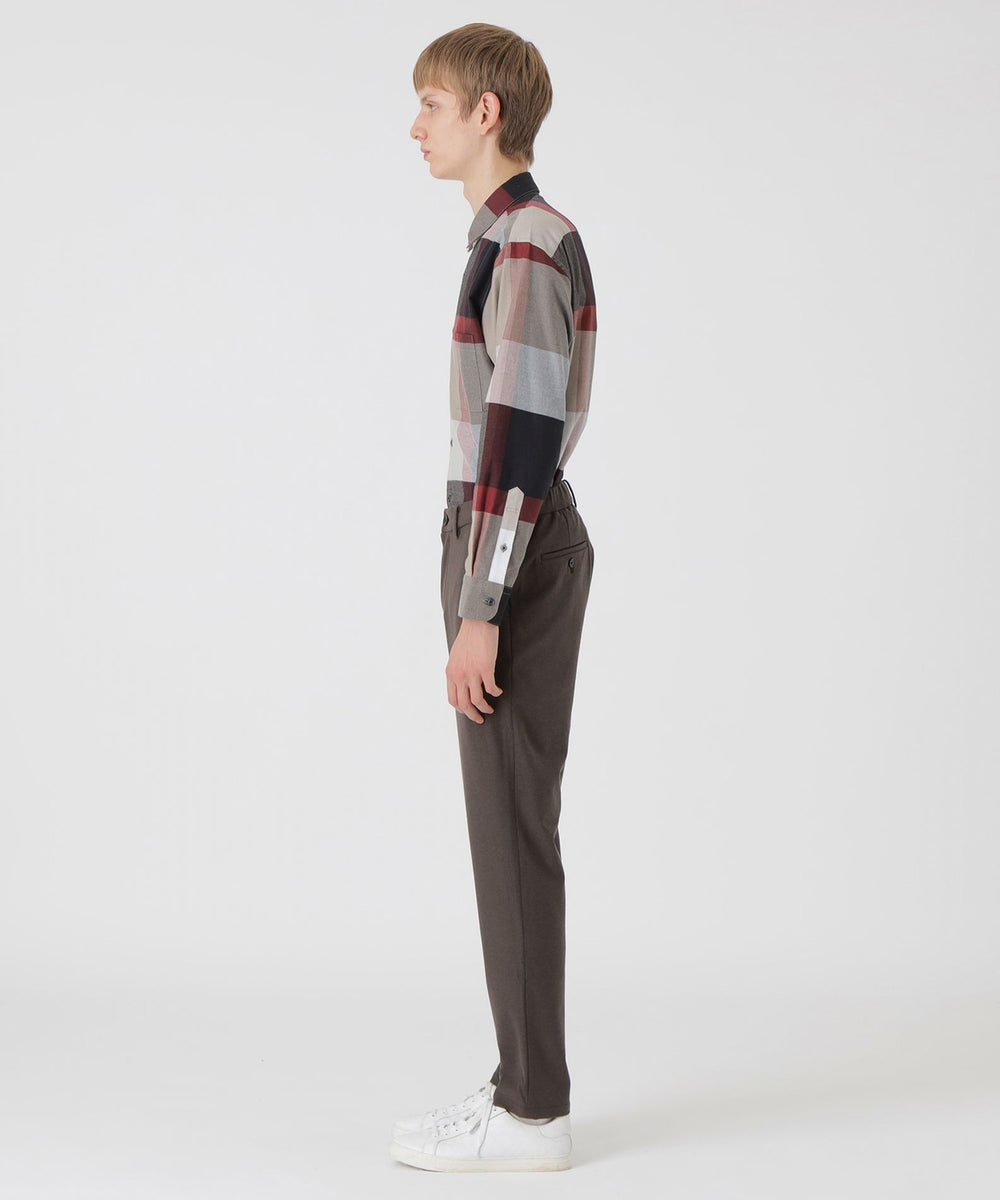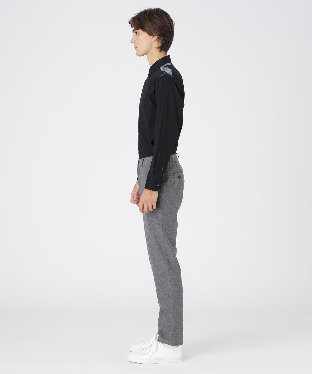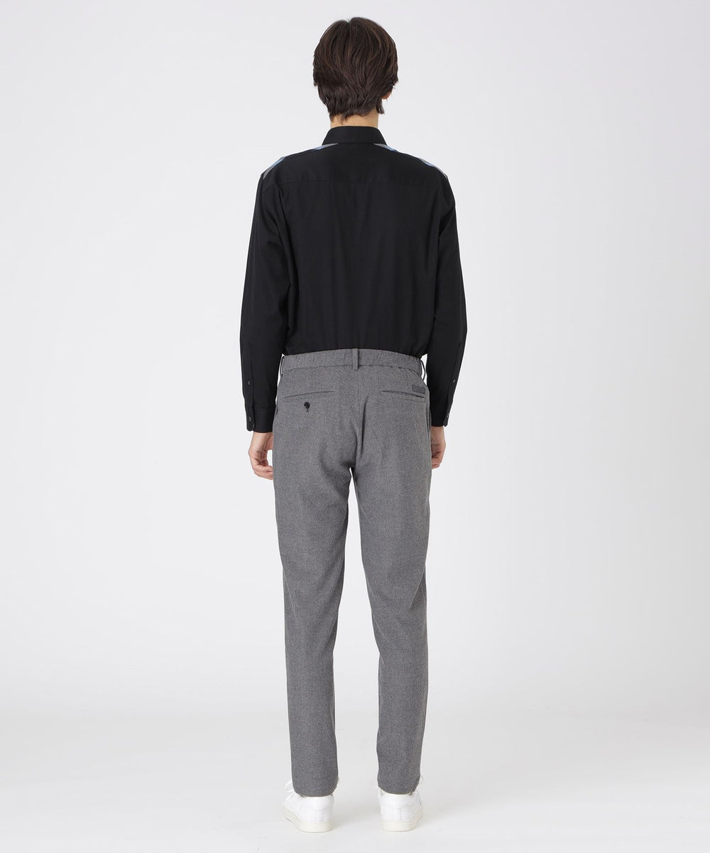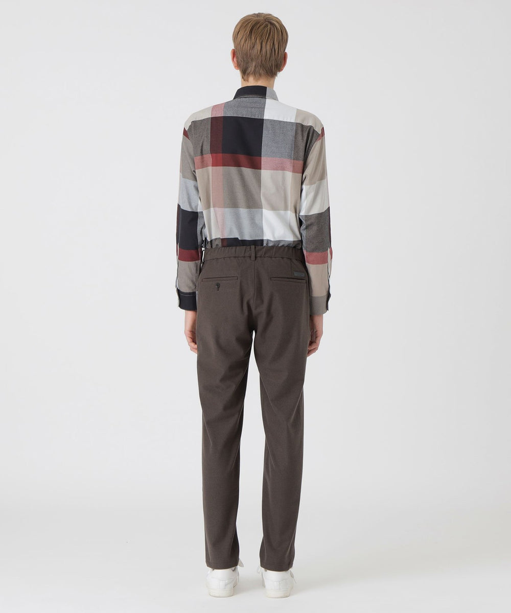 タテヨコにストレッチ性抜群の起毛ツイル素材を使用したトラウザーズ。シャープな印象を持たせる細身のシルエットながらも、ウエスト部分にはゴムシャーリングを施し快適な履き心地。シンプルなデザインの為、コーディネートを選ばず幅広いシーンで着用が可能です。