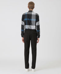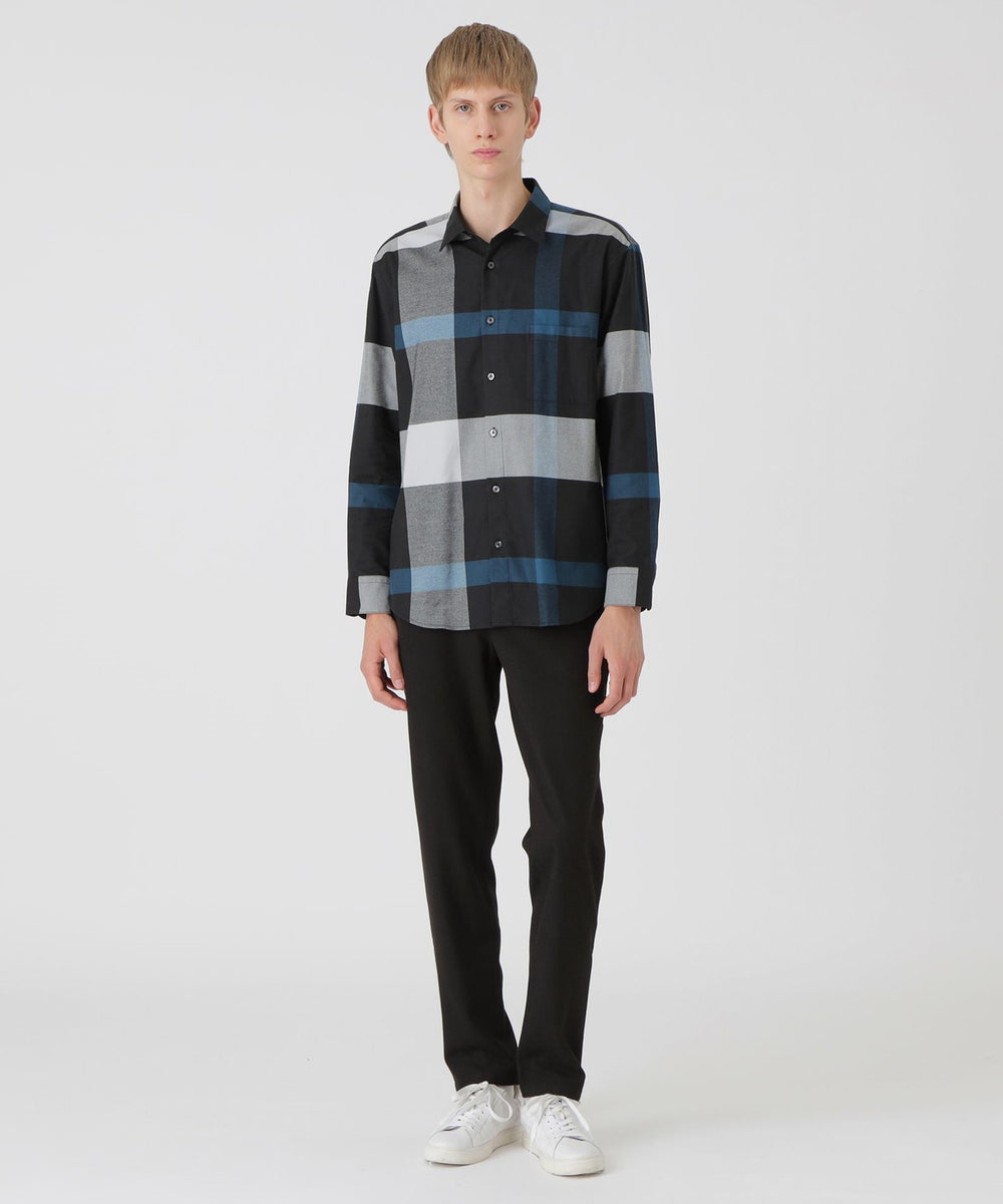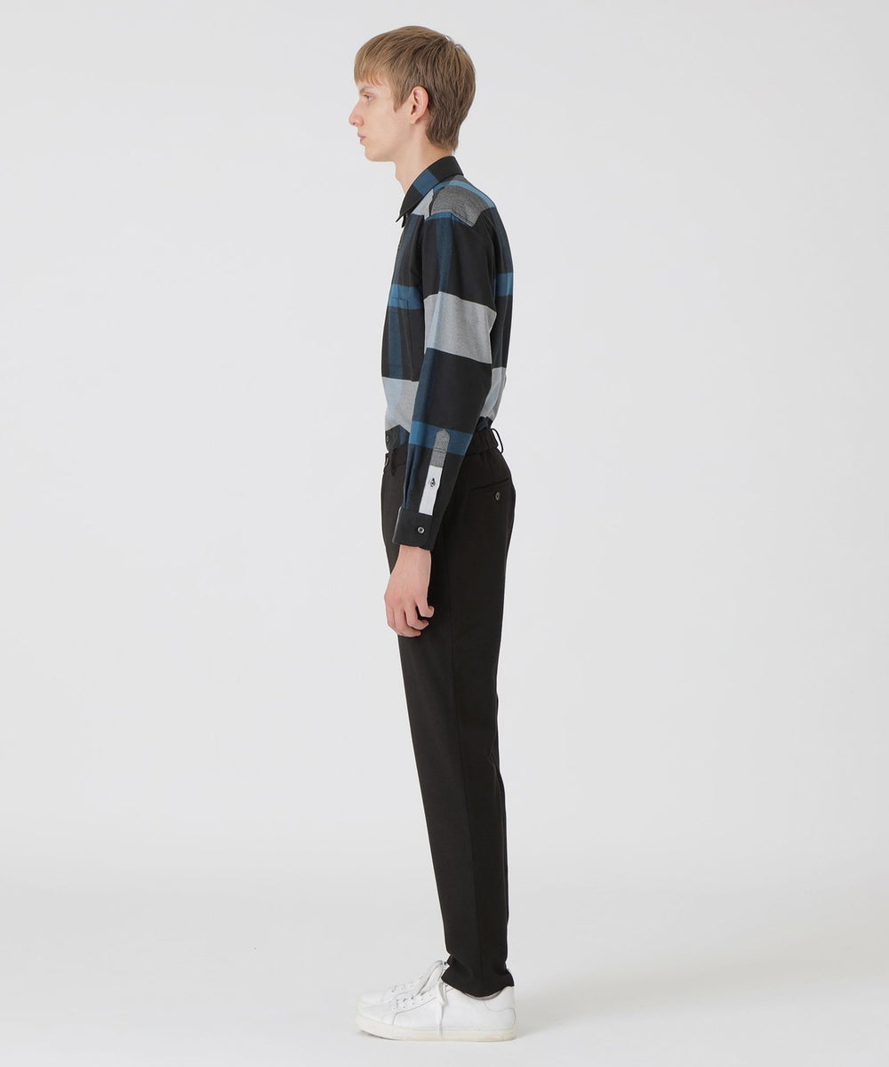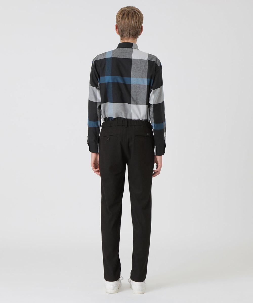 タテヨコにストレッチ性抜群の起毛ツイル素材を使用したトラウザーズ。シャープな印象を持たせる細身のシルエットながらも、ウエスト部分にはゴムシャーリングを施し快適な履き心地。シンプルなデザインの為、コーディネートを選ばず幅広いシーンで着用が可能です。