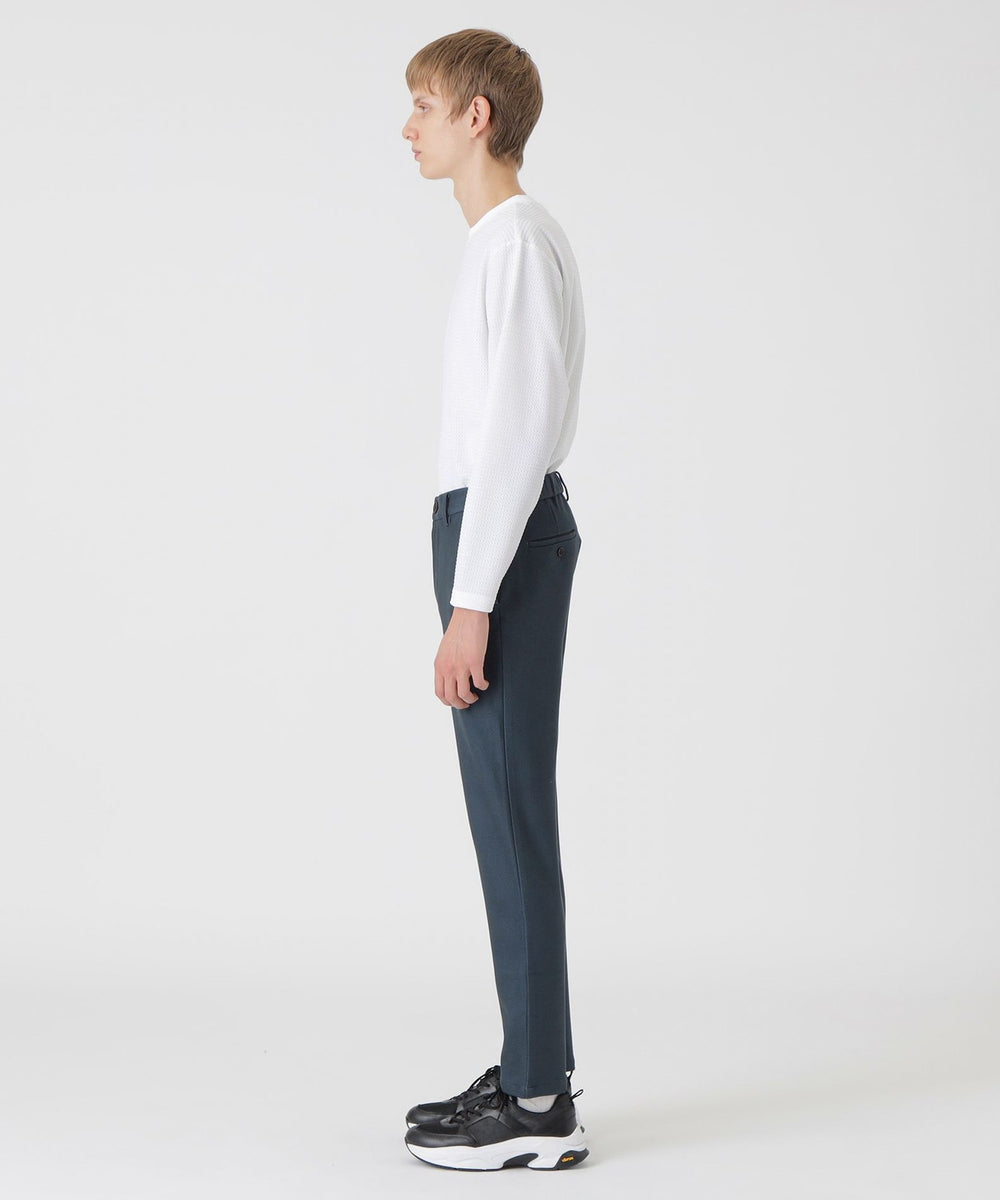 シャープな印象を持たせる細身のシルエットながらも、ウエスト部分にはゴムシャーリングを施し快適な履き心地。幅広いシーンで活躍するベーシックなデザインです。