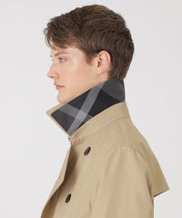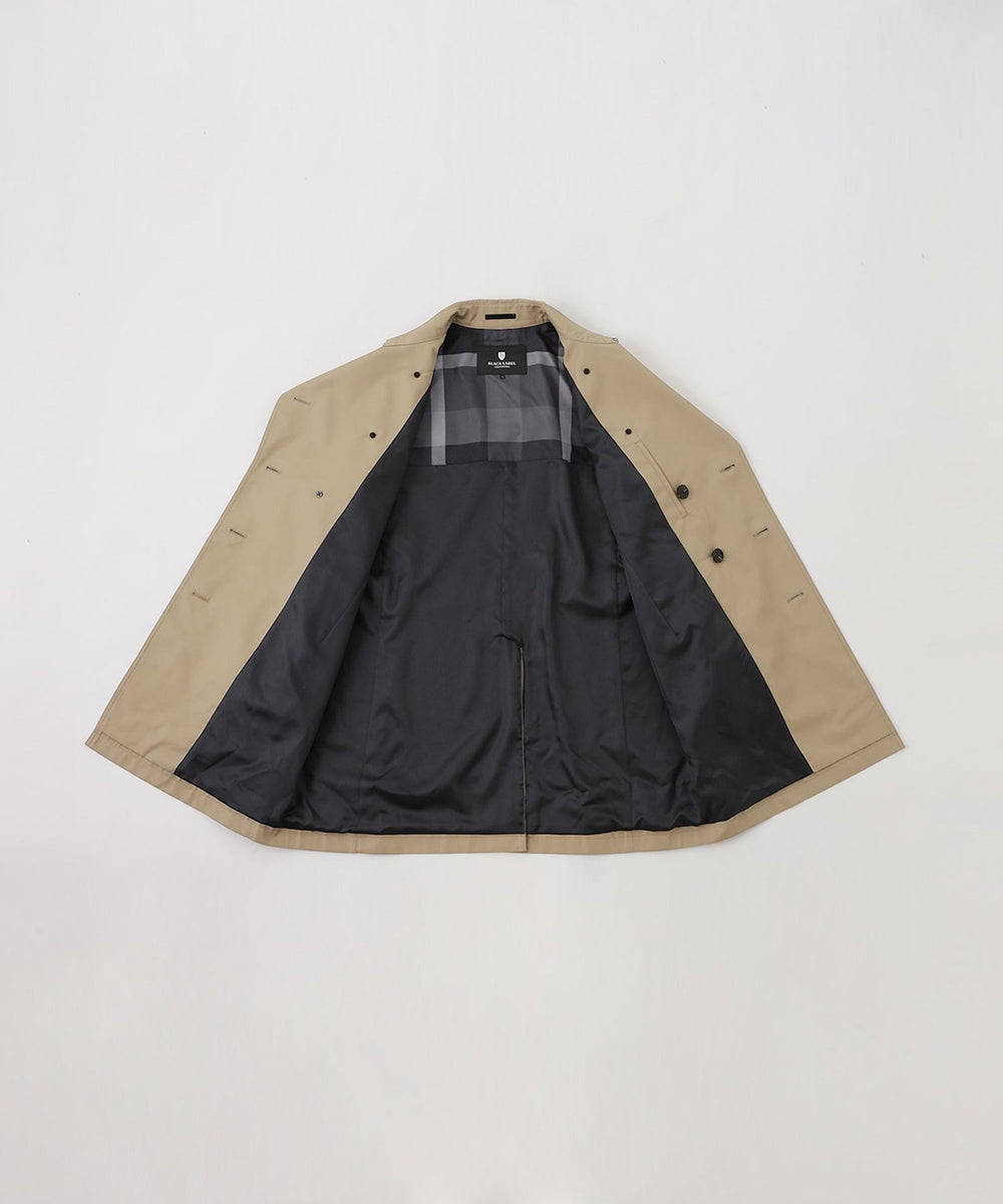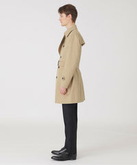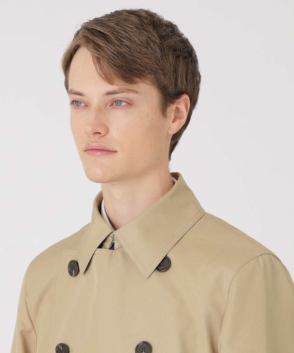 【ポリエステル混のギャバジン素材を使用したダブルブレステッドトレンチコート】