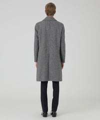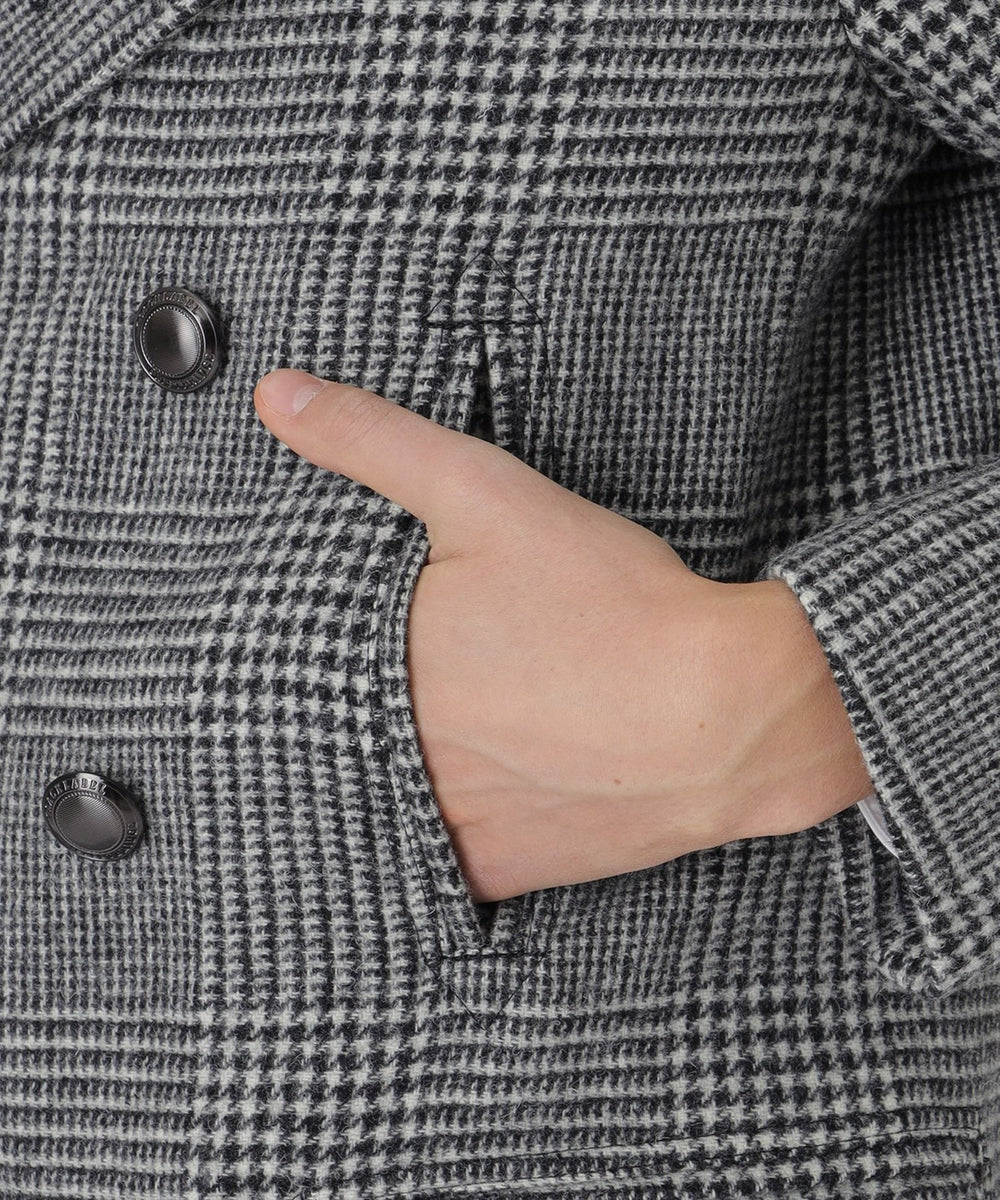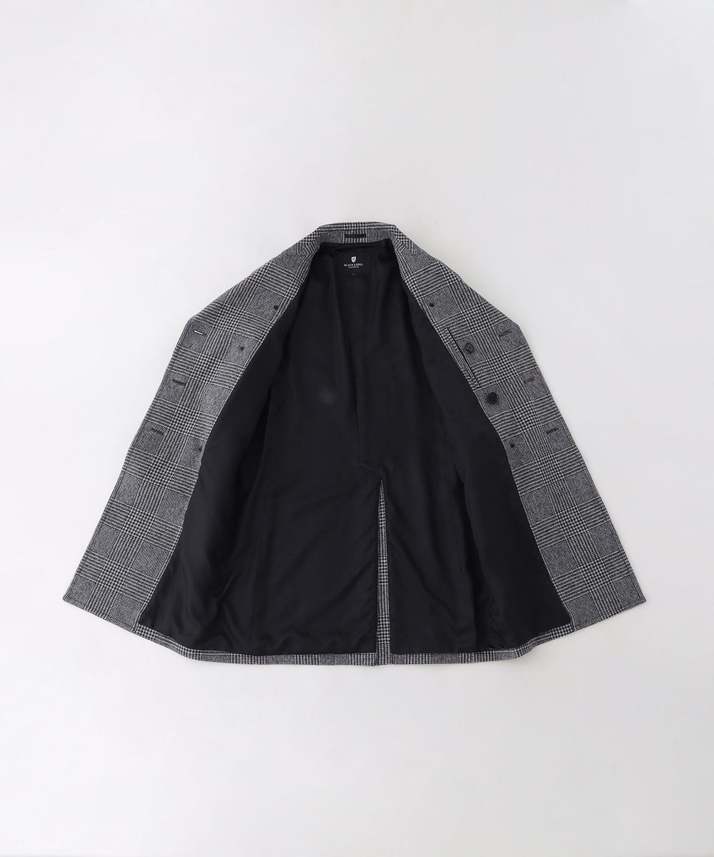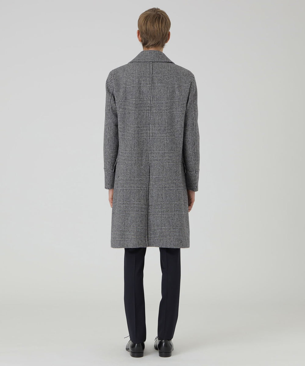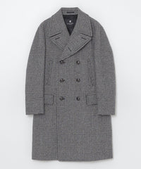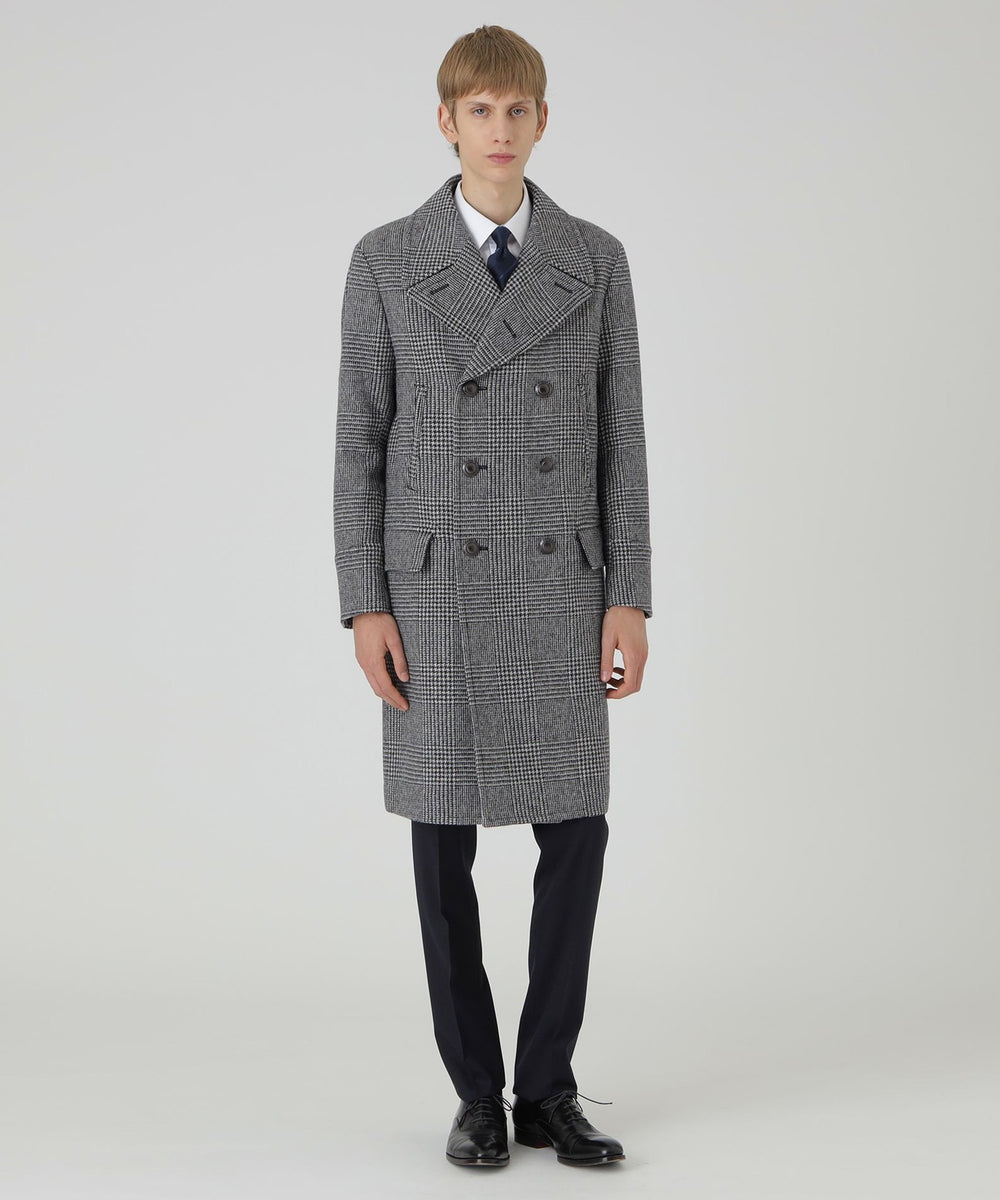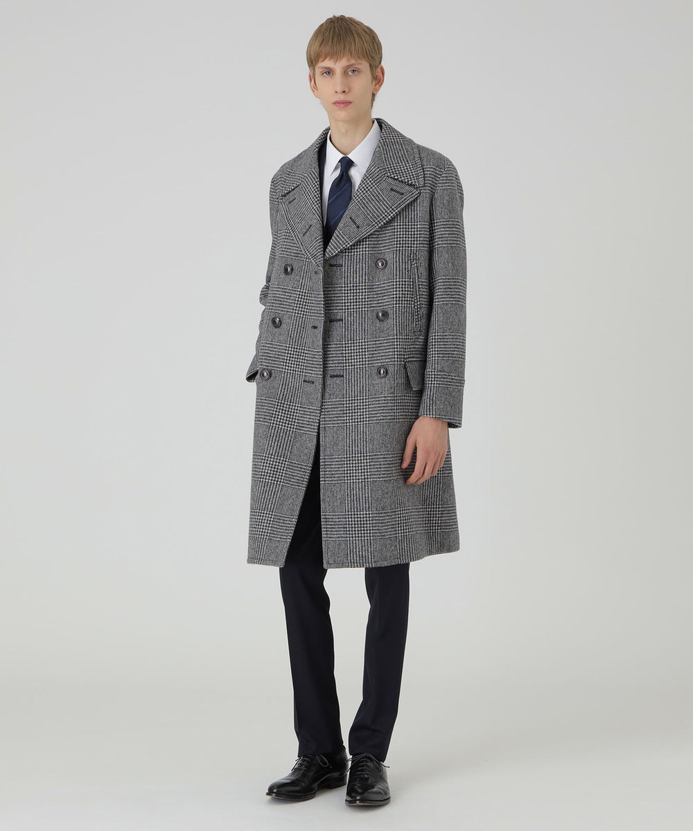 元々は英国軍将校の防寒着として愛用された「ブリティッシュ・ウォーム」をベースに、モダンにアレンジしたグレンチェック柄ダブルブレストコート。オリジナルで刻印したメタルドームボタンが重厚感を添え、裏地にはブランドロゴジャカード裏地を採用。大ぶりな襟やハンドウォーマーポケット等の本格的なディテールを採用し、洗練されたデザインと構築的なシルエットが特徴です。スーツやジャケットとのコーディネートから、ニットとのコーディネートまで着こなしの幅が広い1着です。