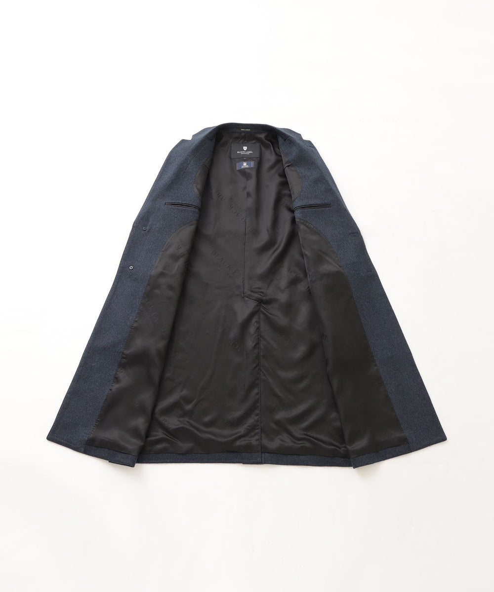 ノッチドラペルに2つボタンを配した、オーセンティックなデザインのチェスターフィールドコート。リラックス感のあるAラインシルエットで、ジャケットの上からでも羽織れるサイズ感の為、オンオフ問わず様々なシーンでご着用いただけます。パットレスですが、綺麗に構築された肩のライン、抜群のフィット感、フロントから肩にかけてフロントの芯地のみで構成された仕立てならではの軽い着心地が特徴です。ブランドロゴをジャカードにて表現した裏地を使用し、付加価値の高い1着に仕上げています。