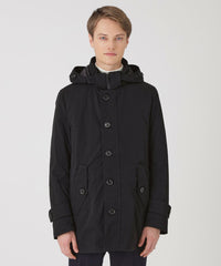 素材には特殊な染色技術と加工を施すことによって、通常の黒色よりも深みのある色合いを実現した「BLACK of BLACKs」ナイロンタッサー素材を使用。「すべての黒の中のまさにひとつだけの黒」をコンセプトに開発されたこの素材は、品格と存在感を放つ「真の黒」を体験できる唯一無二の素材です。表地だけでなく細部までも黒に拘った、都会的なデザインのアウターに花を添える「究極の黒」アウターです。